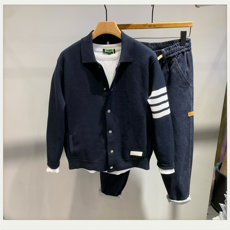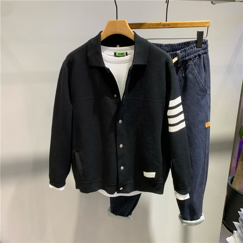 니트 카디건 남성 봄과 가을 트렌디 브랜드 간단한 소매 스티칭 줄무늬 옷깃 재킷 유행 올 매치 슬림 핏 스웨터 재킷스토어 가기