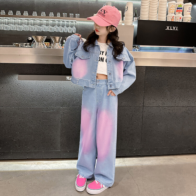 데님 유행 넓은 다리 바지 대형 어린이 세트 가을 코트 Xiaoxiang 스타일 세트 소녀 도파민 2024 를 위한 투피스 세트
