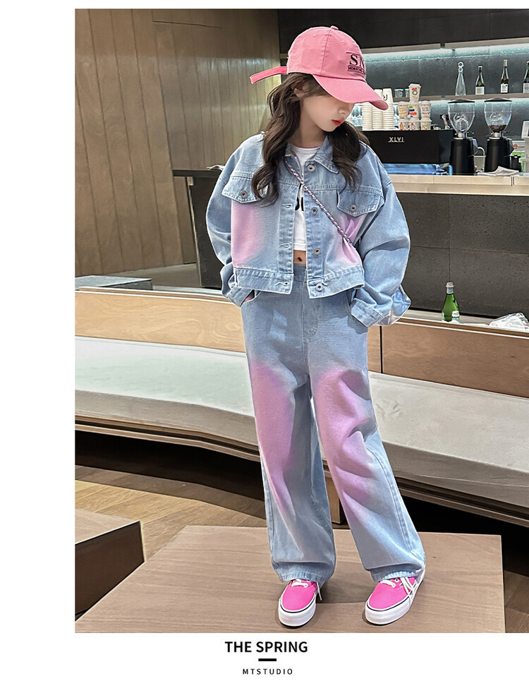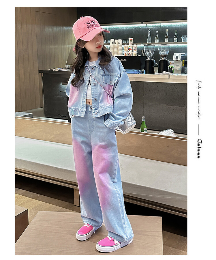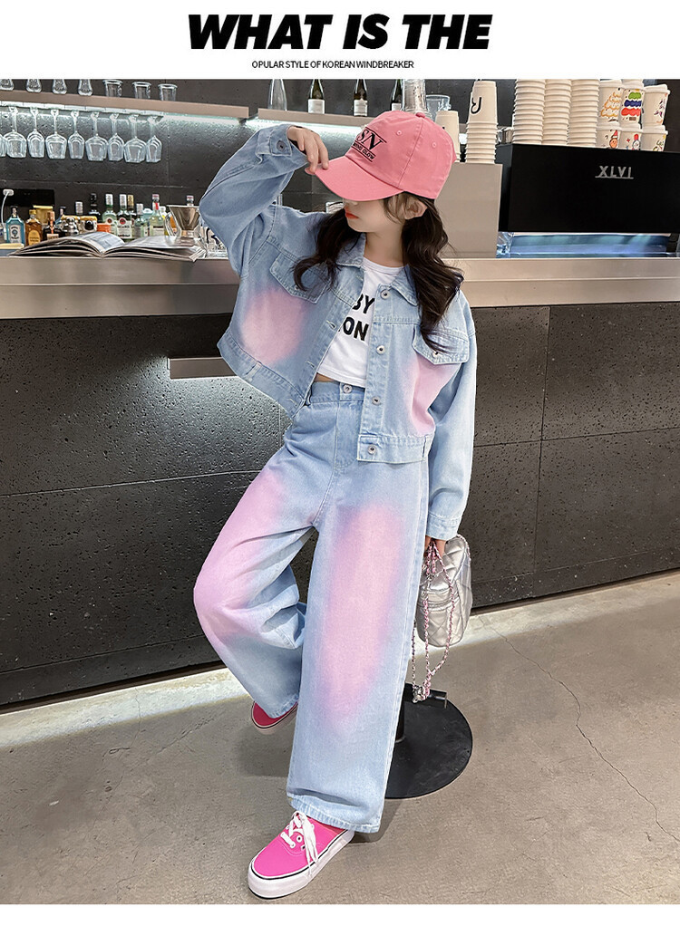 데님 유행 넓은 다리 바지 대형 어린이 세트 가을 코트 Xiaoxiang 스타일 세트 소녀 도파민 2024 를 위한 투피스 세트스토어 가기