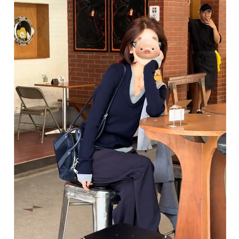 가짜 투피스 대비 컬러 V 넥 긴팔 스웨터 여성의 2024 년 가을 프랑스 스타일 레트로 웨스턴 스타일 슬림 핏 슬림 탑스토어 가기