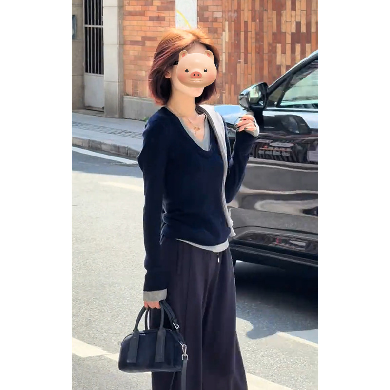 가짜 투피스 대비 컬러 V 넥 긴팔 스웨터 여성의 2024 년 가을 프랑스 스타일 레트로 웨스턴 스타일 슬림 핏 슬림 탑