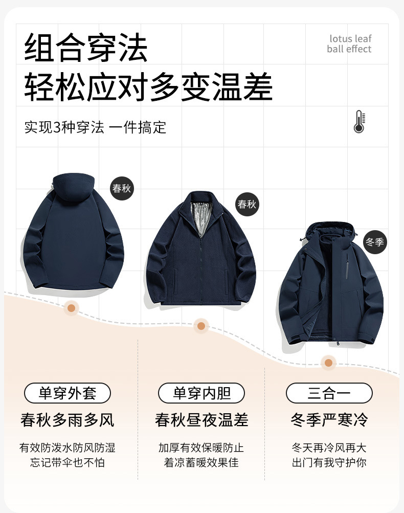 야외 열 밀봉 실시간 분리 가능한 3 대 1 그래핀 라이너 내풍 방수 통근 재킷
