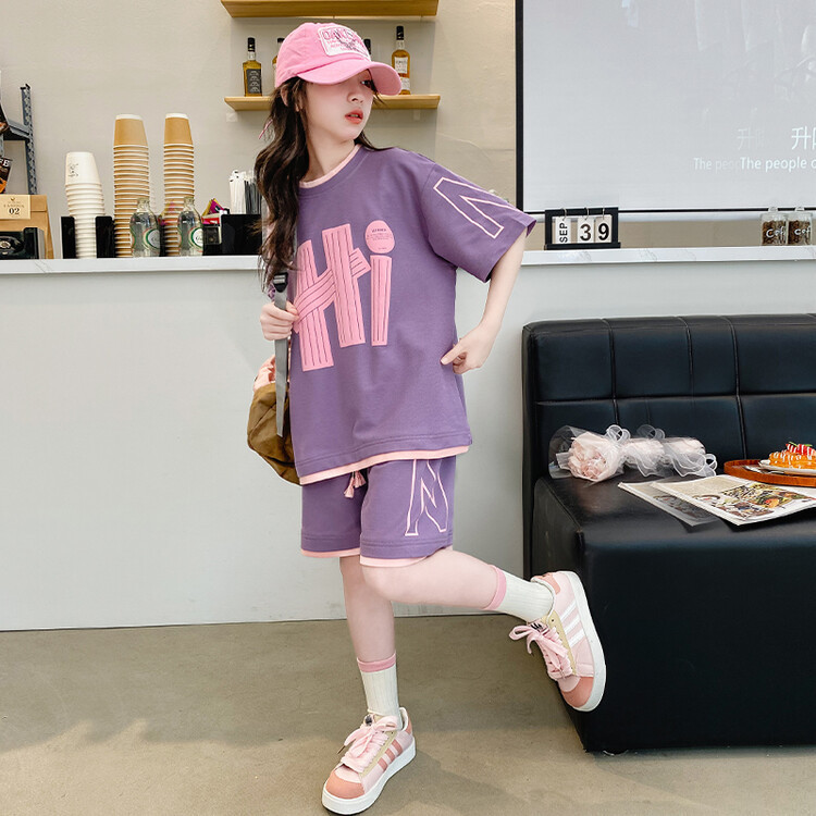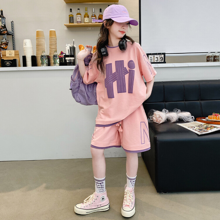 반바지 편지 반팔 얇은 투피스 세트 2024 새로운 스타일 어린이와 소녀 세트 유행 여름 캐주얼 웨스턴 스타일