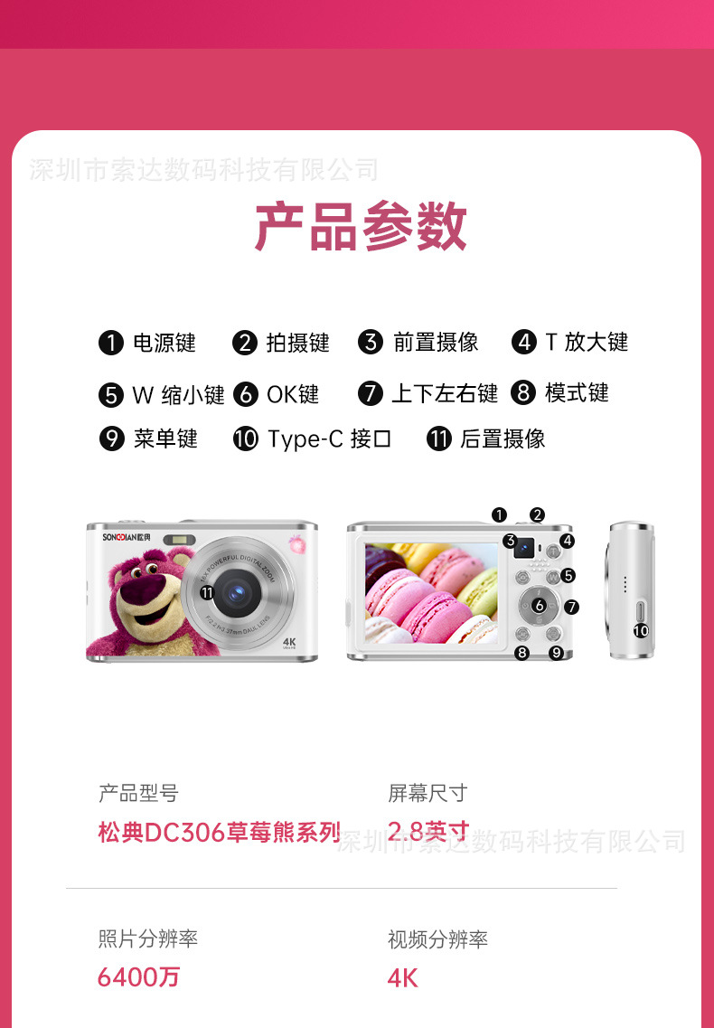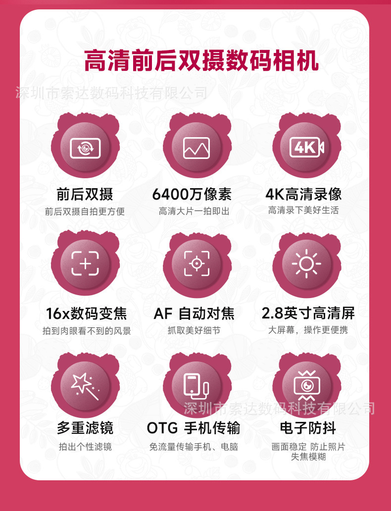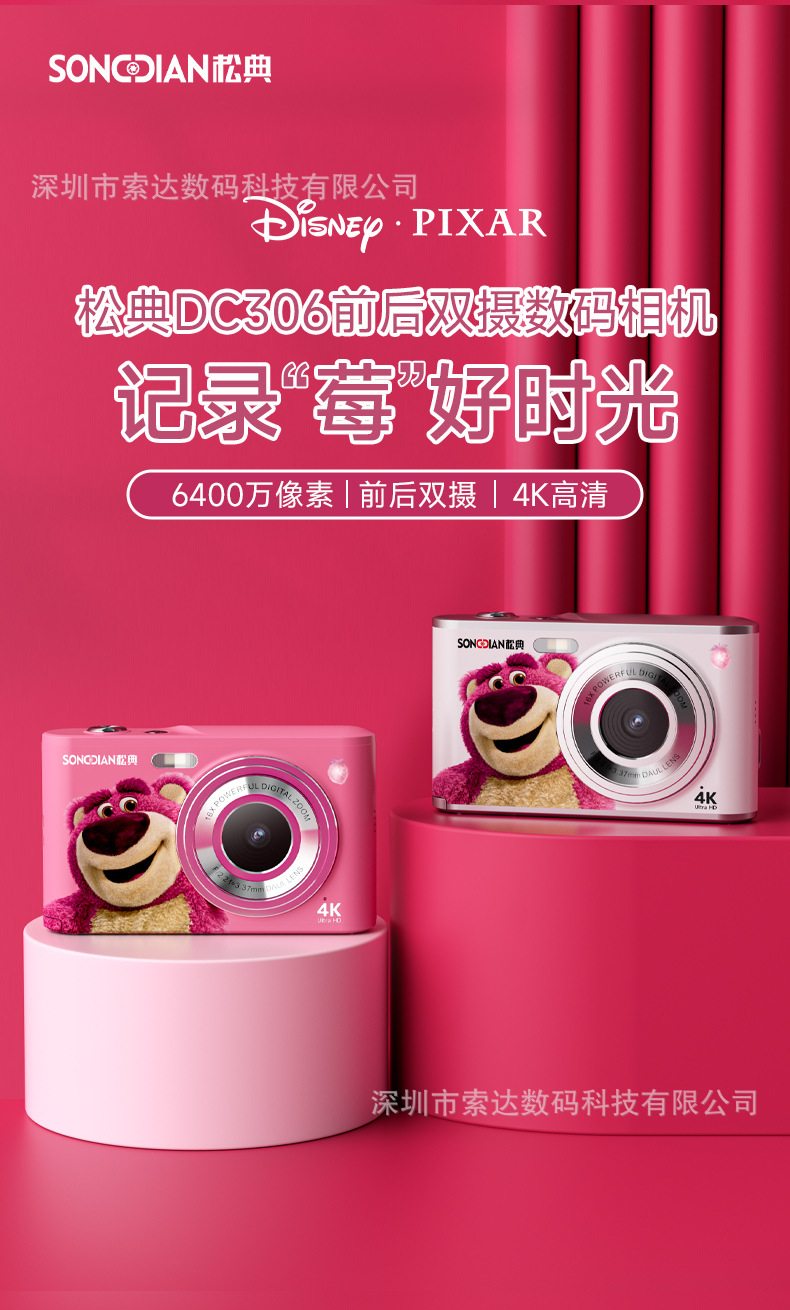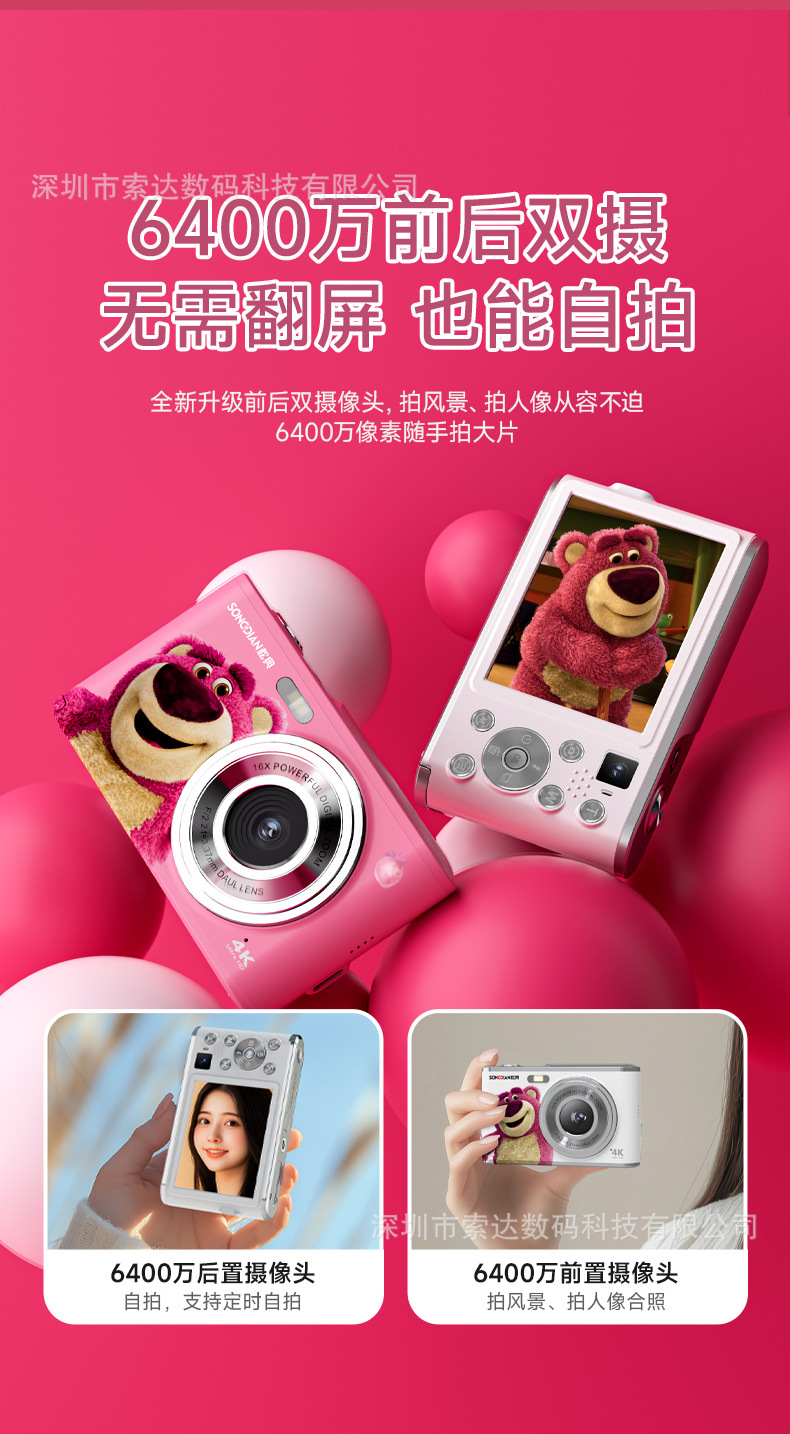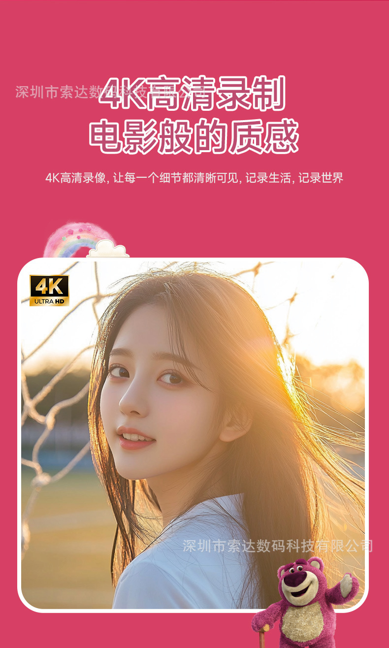 【송디안-공동브랜드 딸기곰】4K 디지털 카메라 학생용 카메라 딸기곰 공동브랜드 신제품스토어 가기