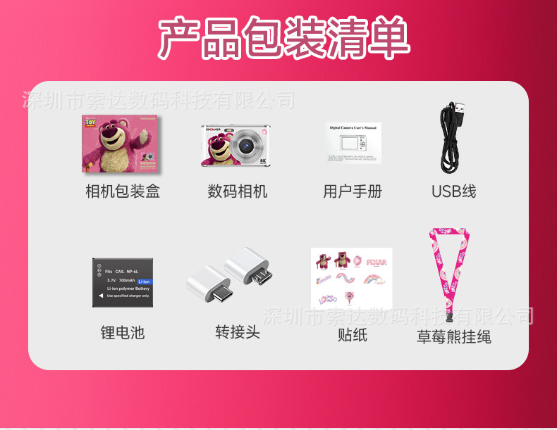 【송디안-공동브랜드 딸기곰】4K 디지털 카메라 학생용 카메라 딸기곰 공동브랜드 신제품
