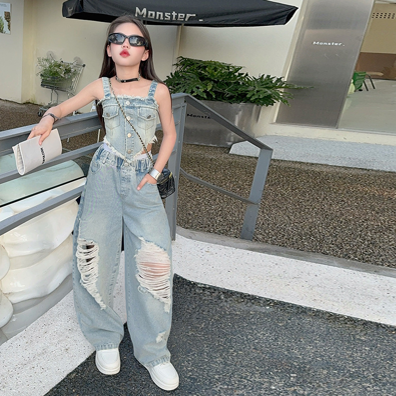 랩 엣지 새로운 한국 스타일 데님 슬링 미드 빅 키즈 2024 여자 여름 세트 넓은 다리 찢어진 얇은 청바지