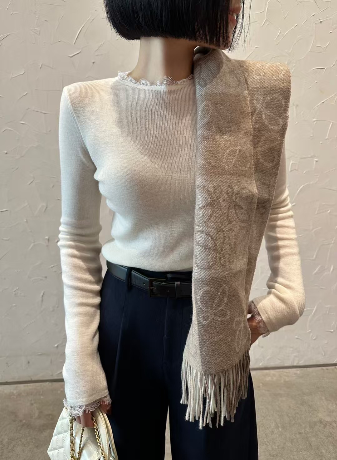 精致蕾丝花边,为整体增添了一抹不可抗拒的浪漫气息。每一处细节,都是对美的追求。独特的半高领设计,恰到好处地修饰颈部线条,既保暖又不失风度。无论是单穿还是作为内搭,都能轻松驾驭,展现女性独有的含蓄美与高级感。无论是搭配高腰裤装,还是优雅半身裙,这款羊毛半高领毛针织上衣都能完美融合,轻松驾驭多种风格。无论是职场干练,还是休闲时光,都能让您成为人群中最亮眼的存在。