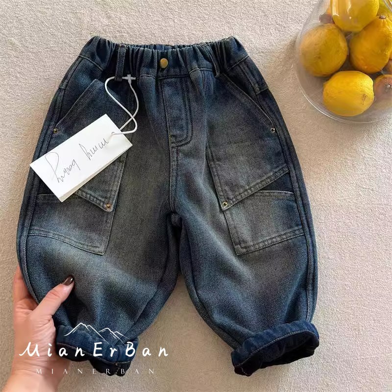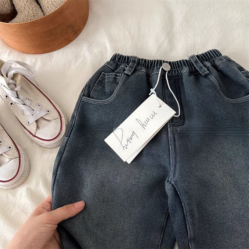 아동용 바지 2024 겨울 스타일 소년과 소녀 만화 곰 플러스 벨벳 청바지 아기 원피스 벨벳 캐주얼 스트레이트 바지스토어 가기