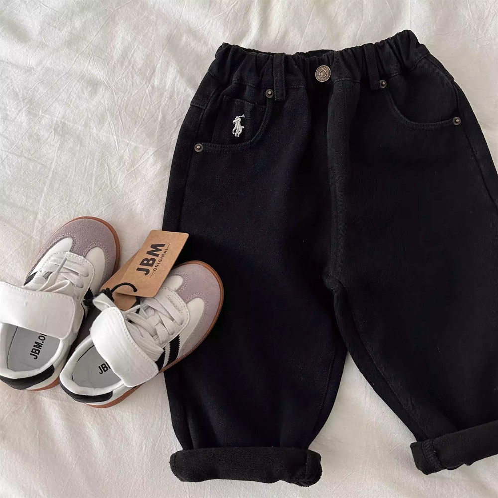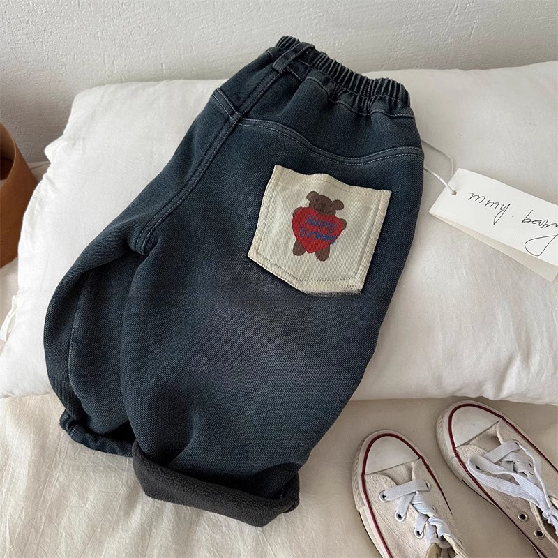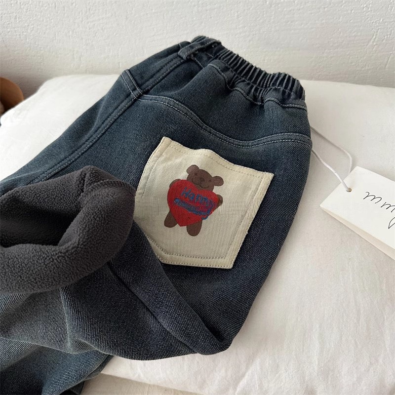 아동용 바지 2024 겨울 스타일 소년과 소녀 만화 곰 플러스 벨벳 청바지 아기 원피스 벨벳 캐주얼 스트레이트 바지