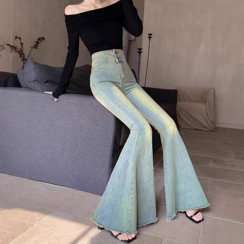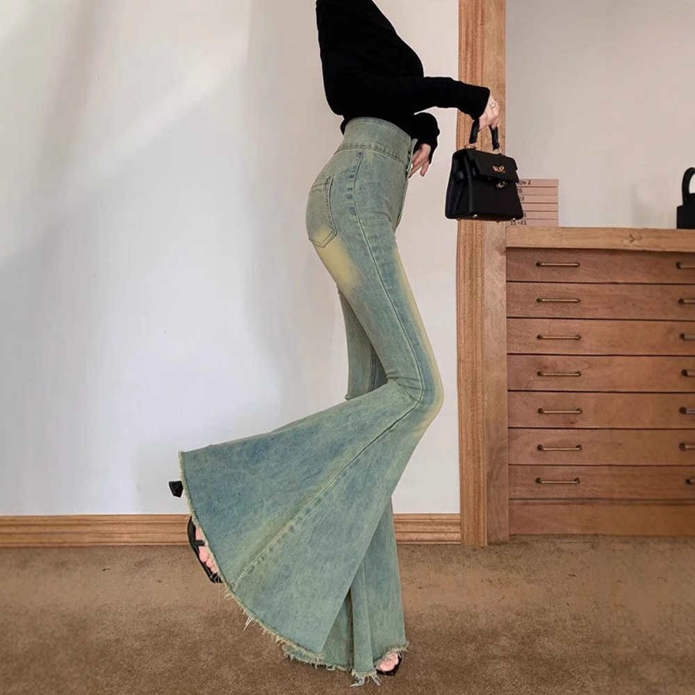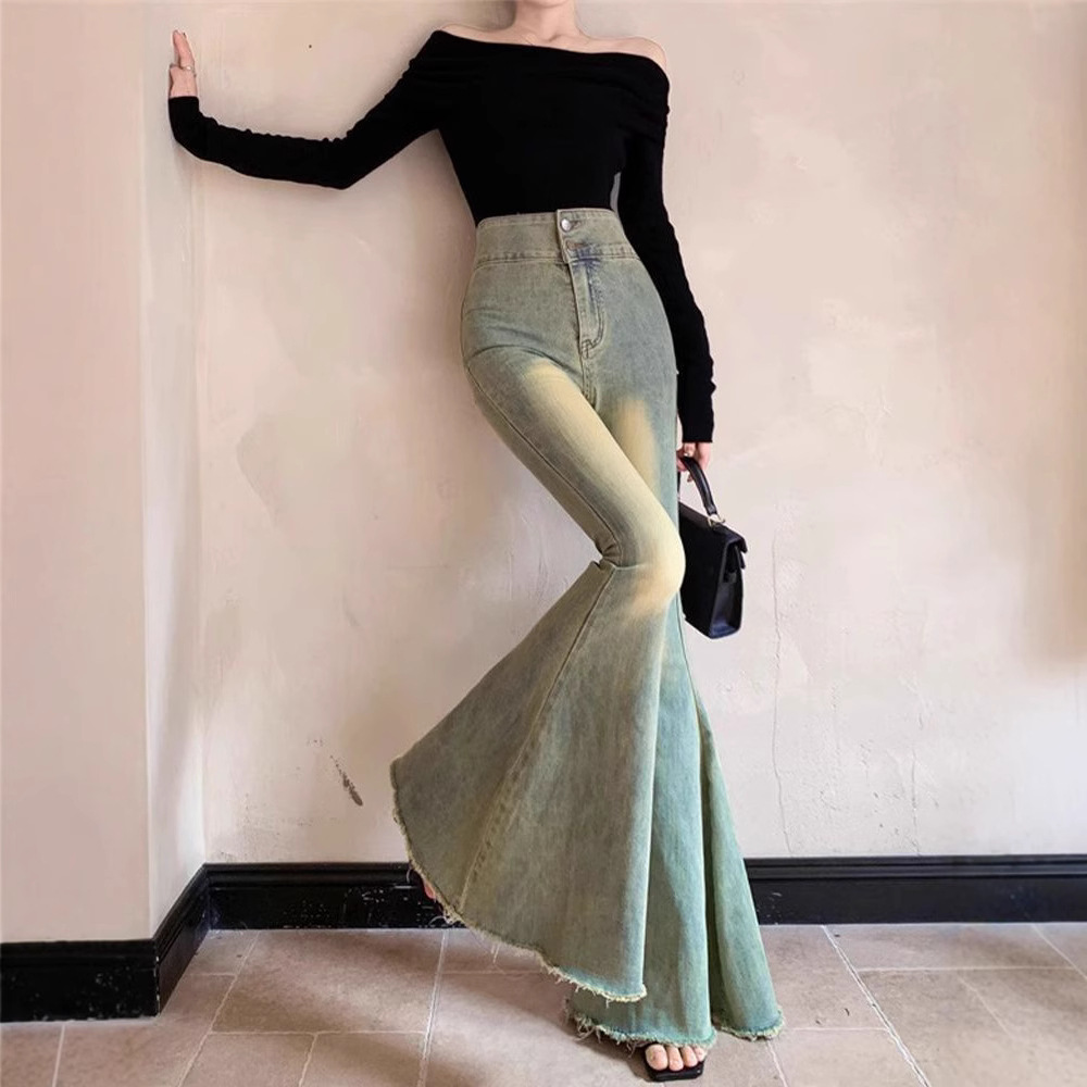 빈티지 씻은 큰 뿔 청바지 여성의 높은 허리 넓은 다리 바지 캐주얼 잘 생긴 Fishtail 바지스토어 가기