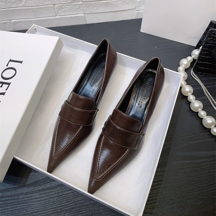 2025년 봄 신상 레트로 스타일 뾰족코 로퍼 여성용 심플 딥컷 슈즈 다용도 얇은 굽 하이힐스토어 가기