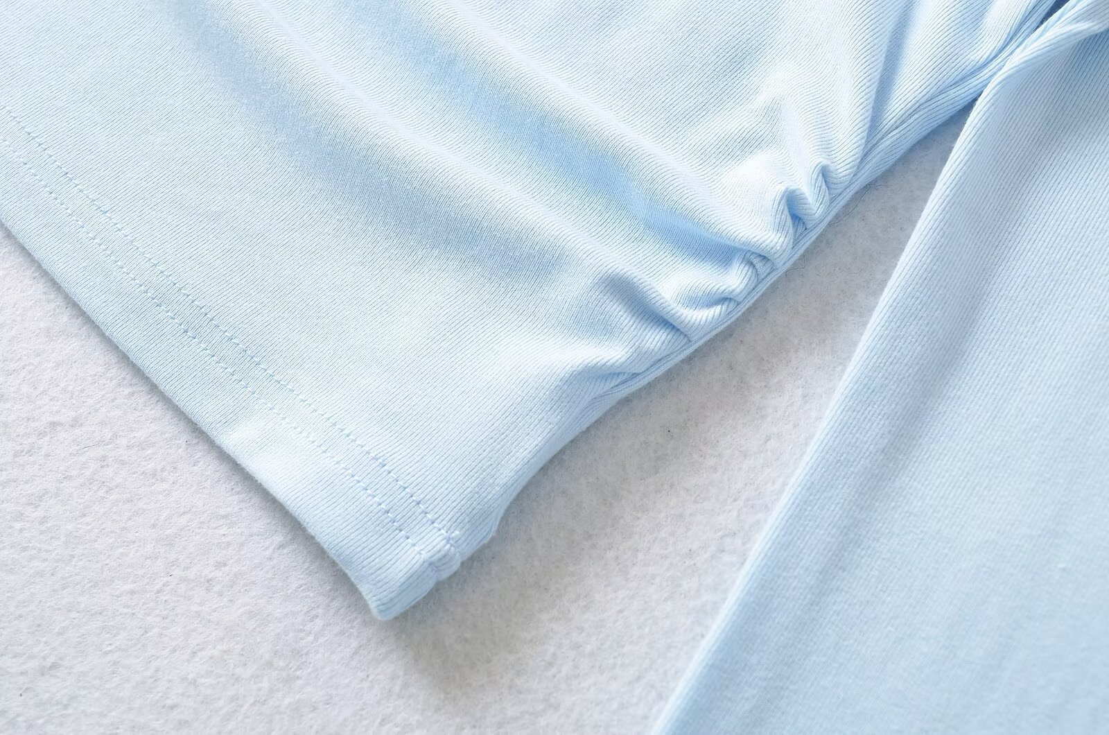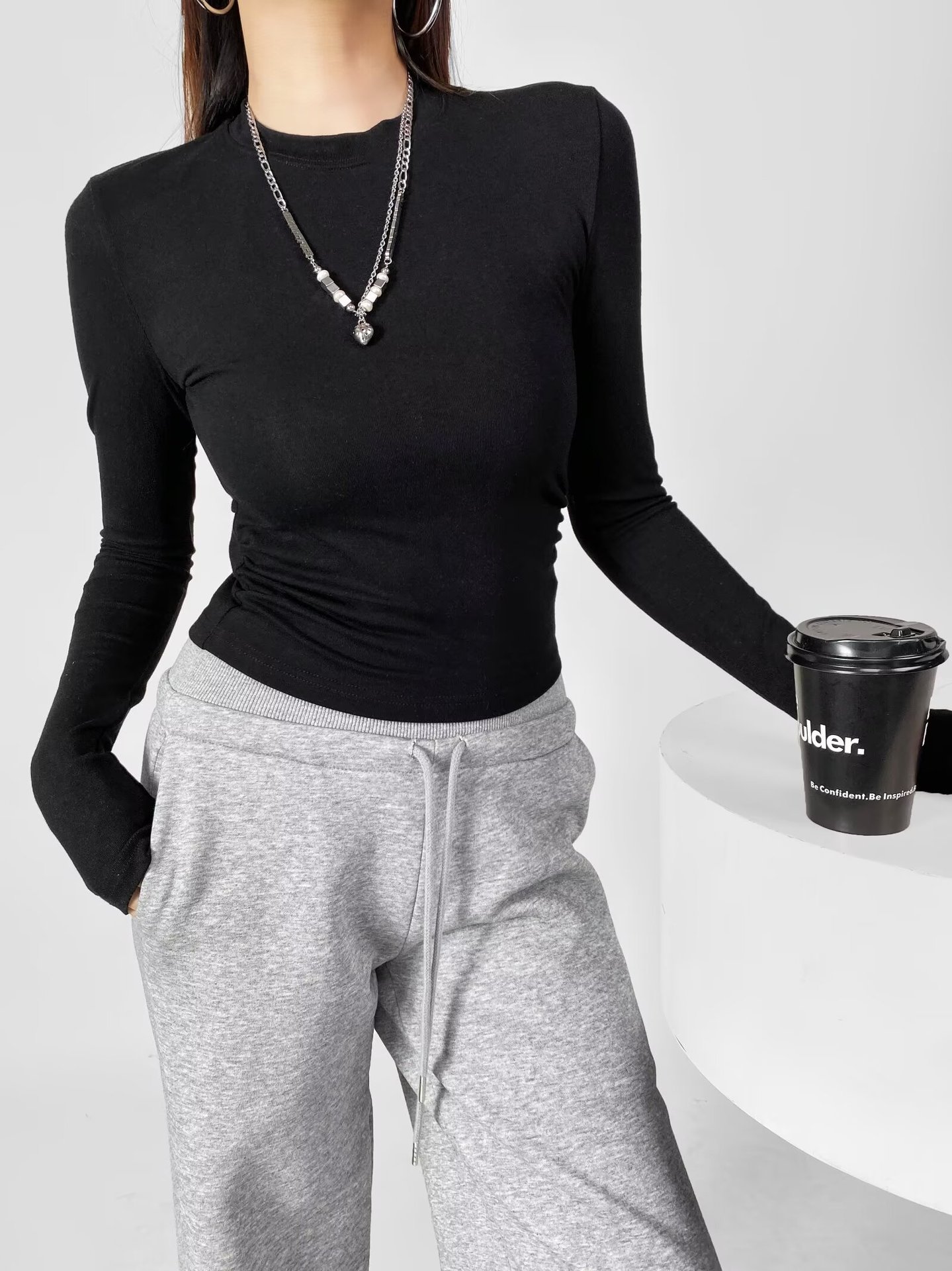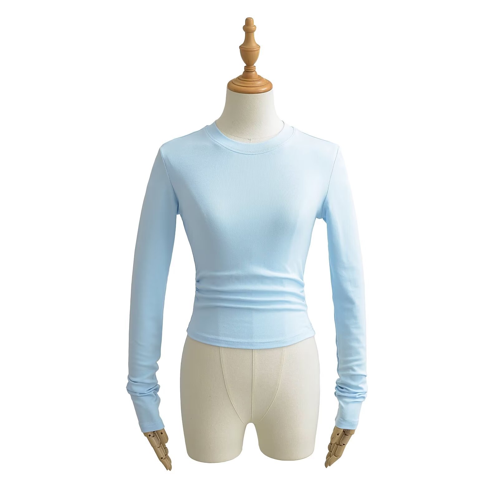 유럽과 미국 스타일의 초가을 새로운 작은 둥근 목 긴 소매 탄성 타이트한 바닥 티셔츠 슬림 핏 얇은 올 매치 쇼트 탑