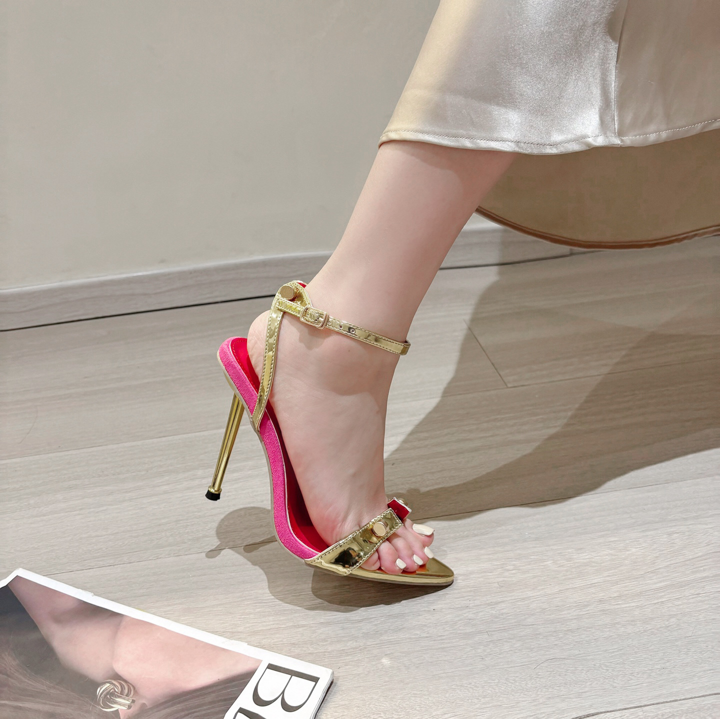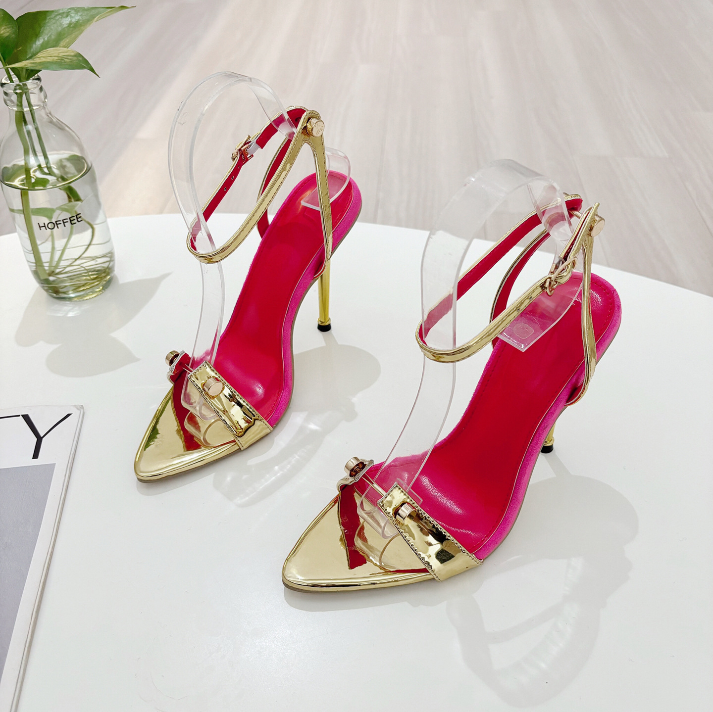 2024 년 여름 오픈 발가락 하이힐 여성 라인스톤 버클 여성 신발 스틸레토 힐 로마 스타일 골든 섹시 샌들스토어 가기