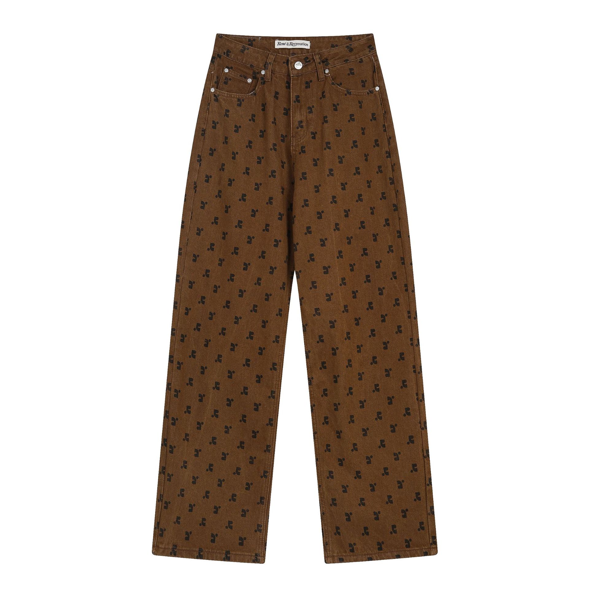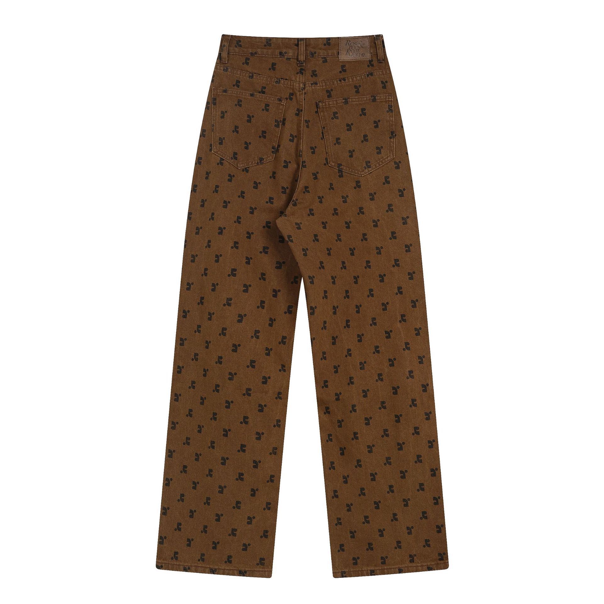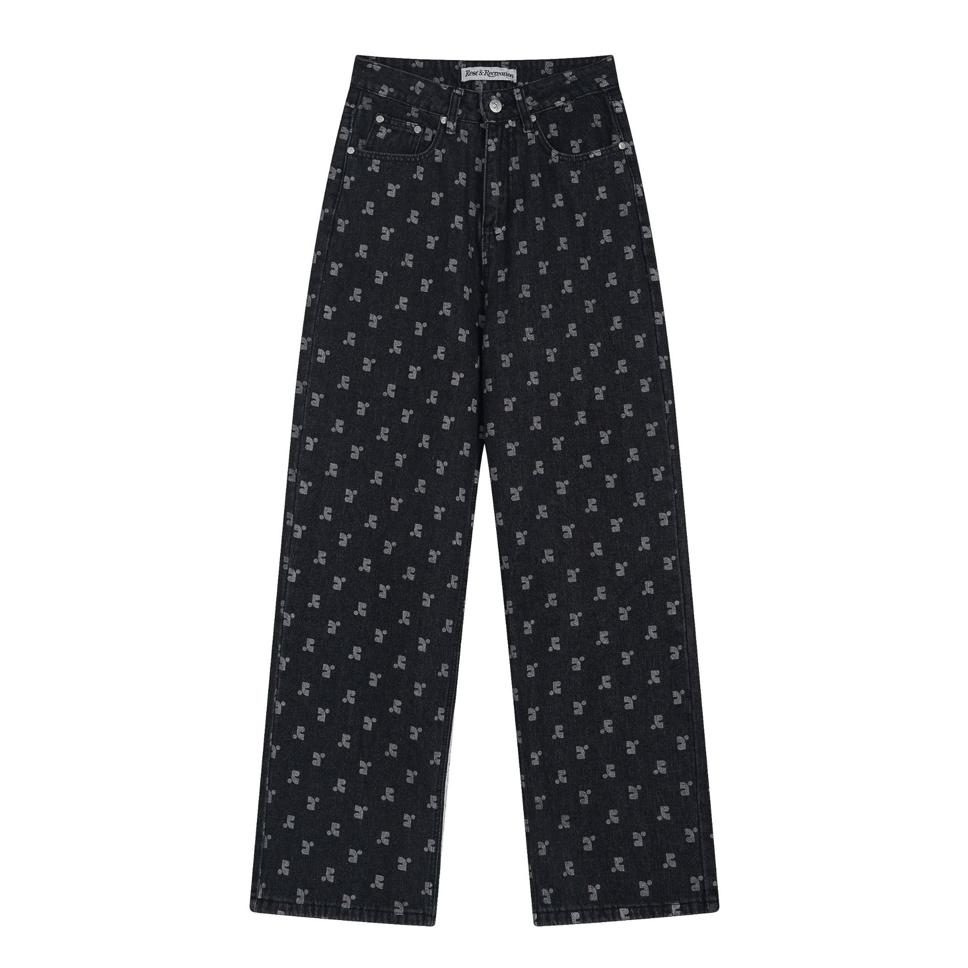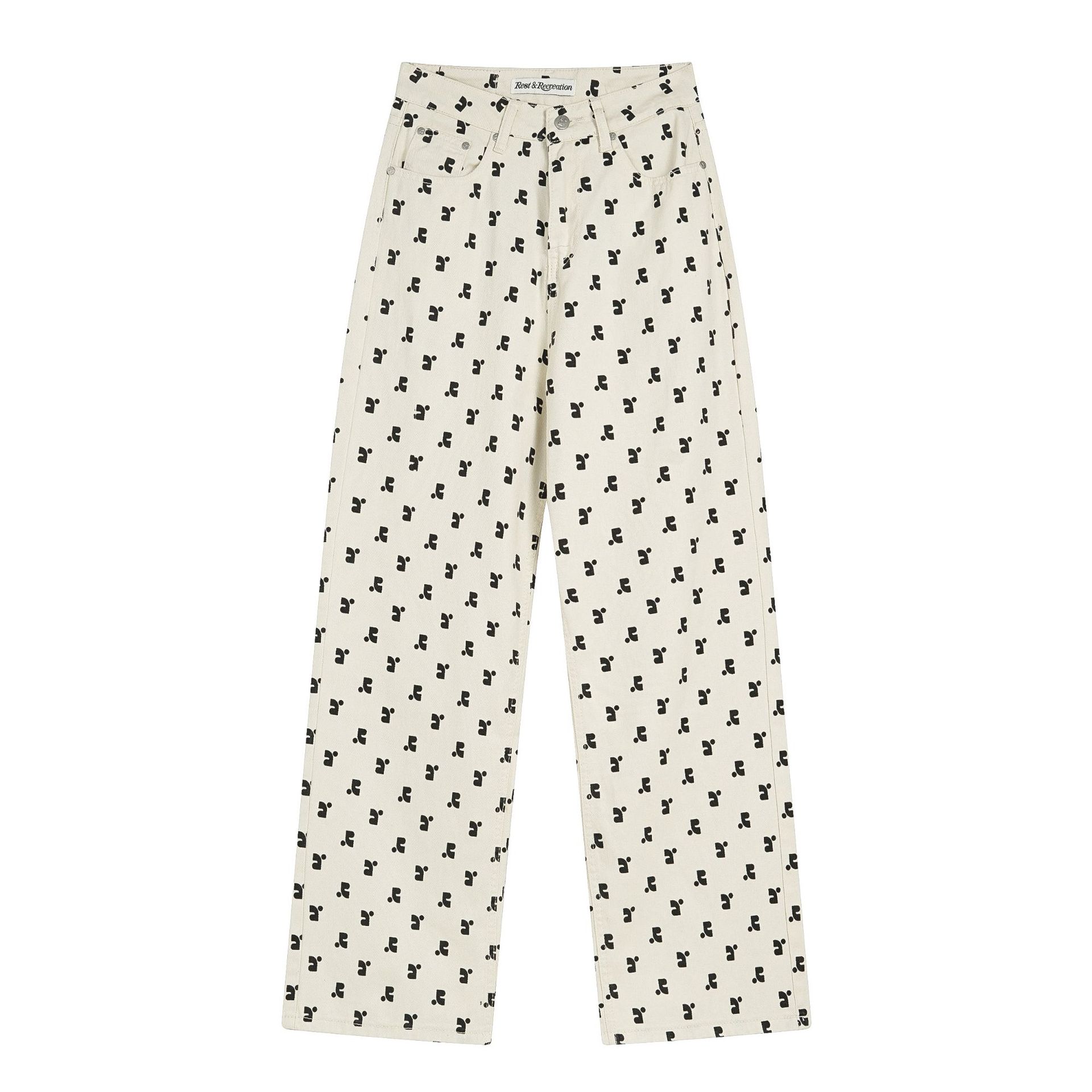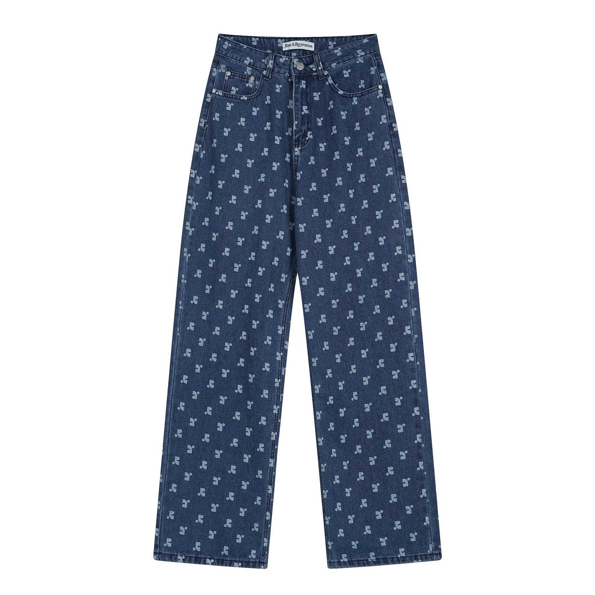 한국의 틈새 트렌드 브랜드 레스트 RR 클로티팀, RR 문자 프린트가 전체적으로 들어간 루즈핏 슬림 데님 팬츠 (여성용)