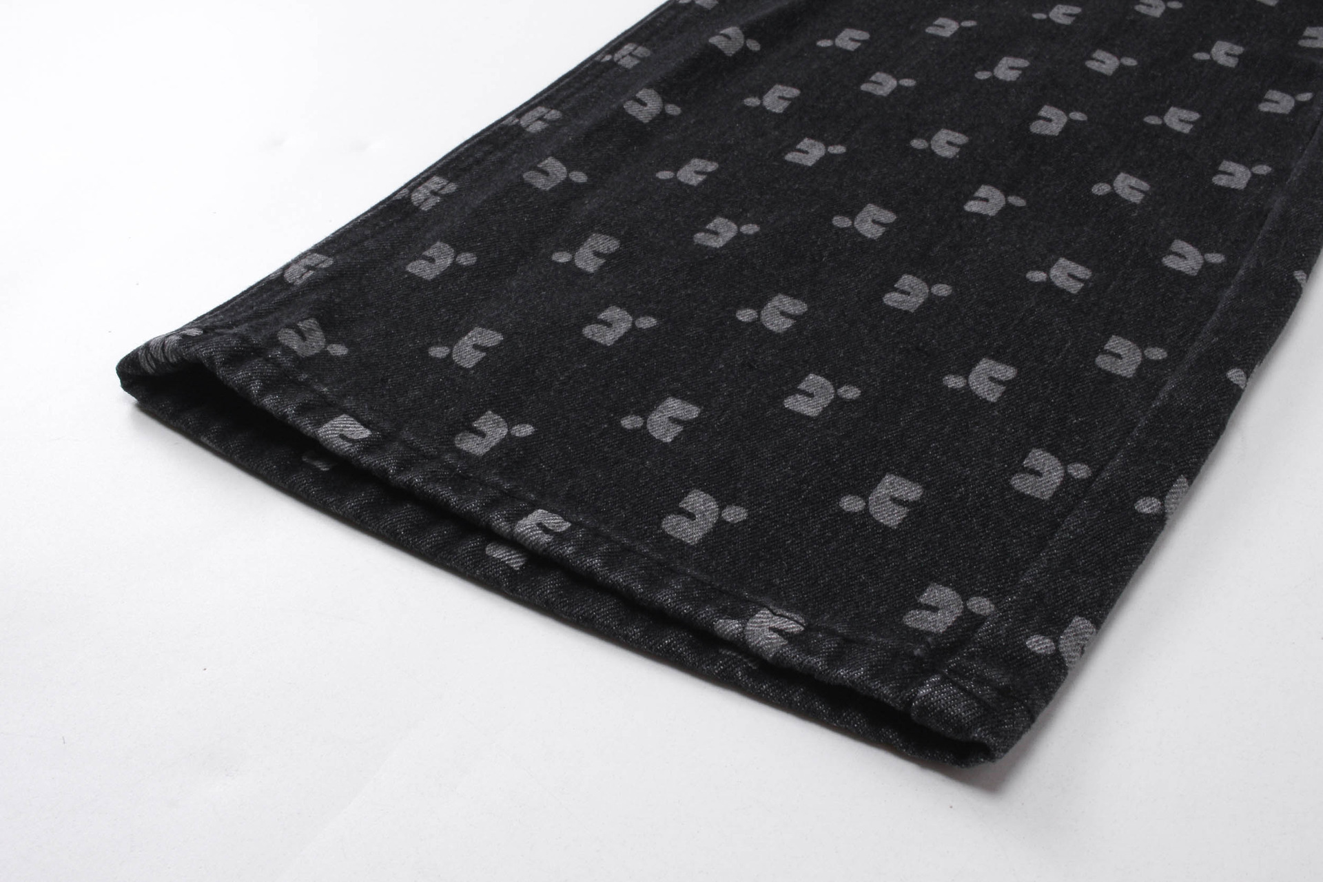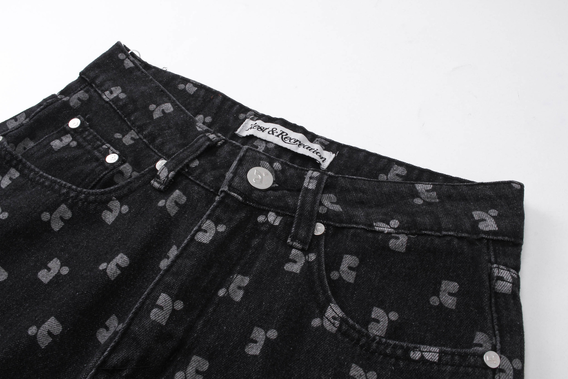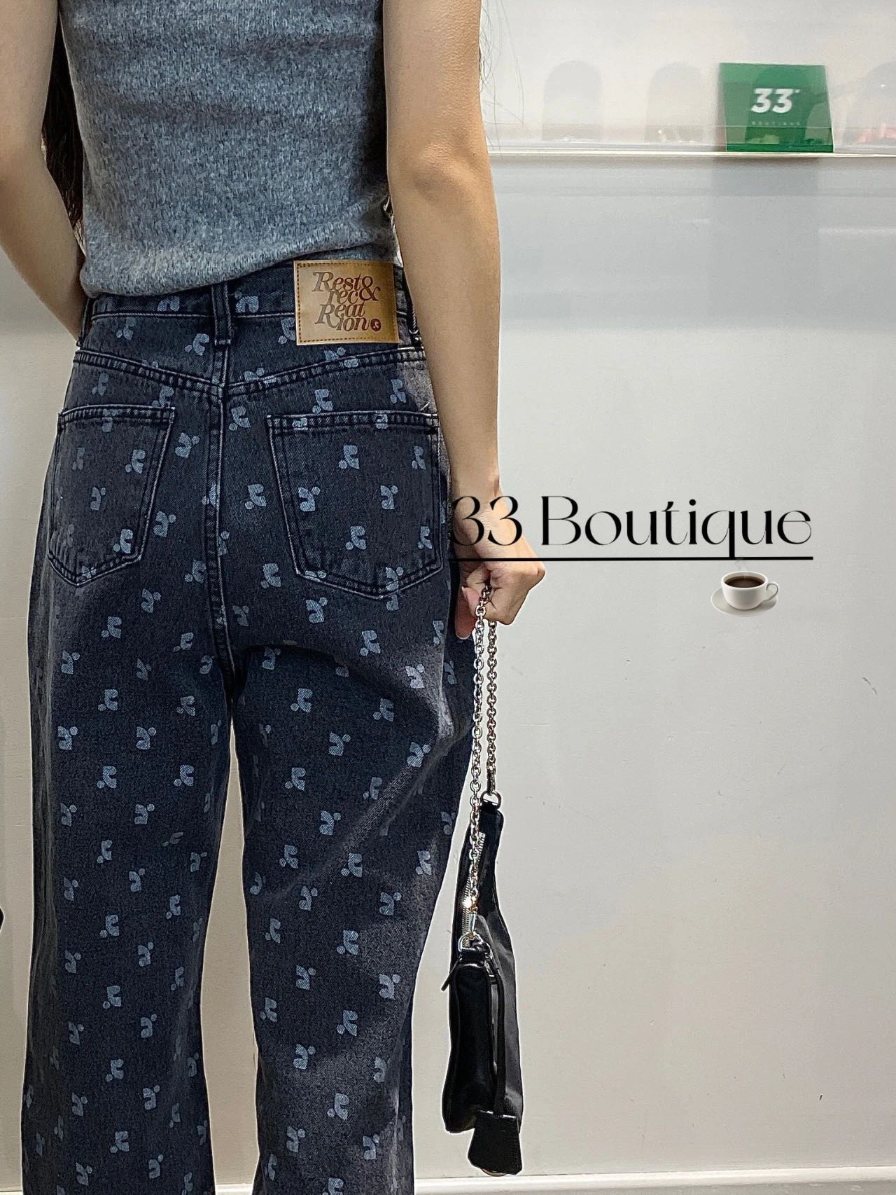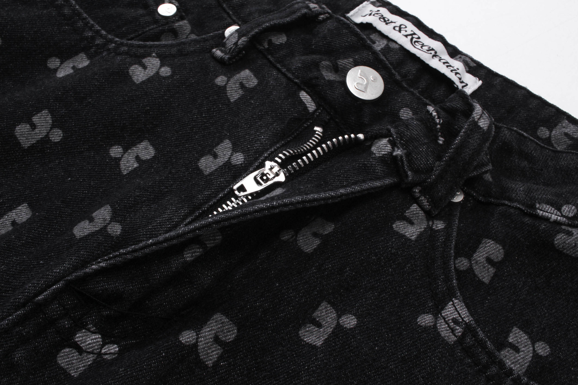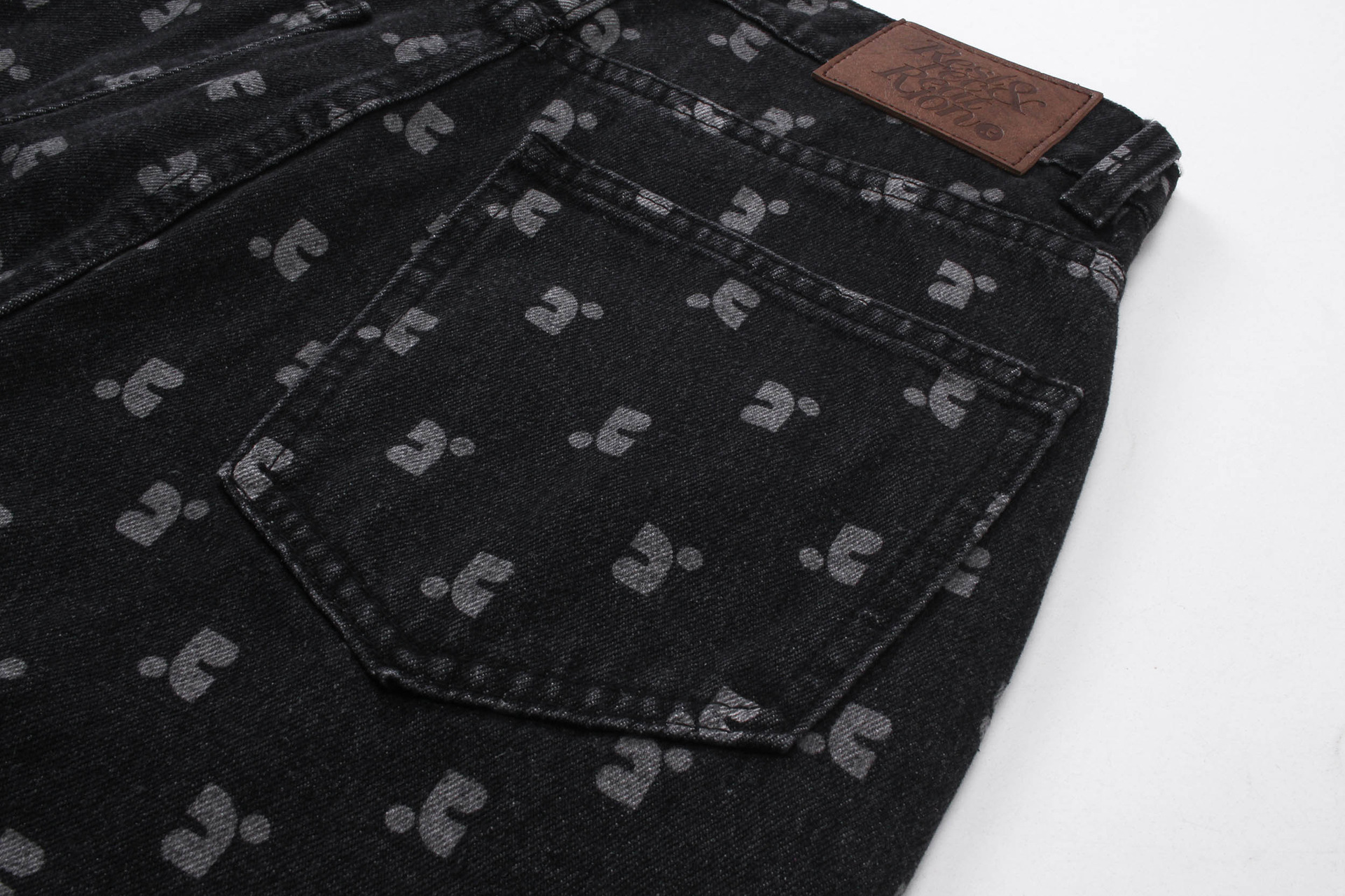한국의 틈새 트렌드 브랜드 레스트 RR 클로티팀, RR 문자 프린트가 전체적으로 들어간 루즈핏 슬림 데님 팬츠 (여성용)스토어 가기