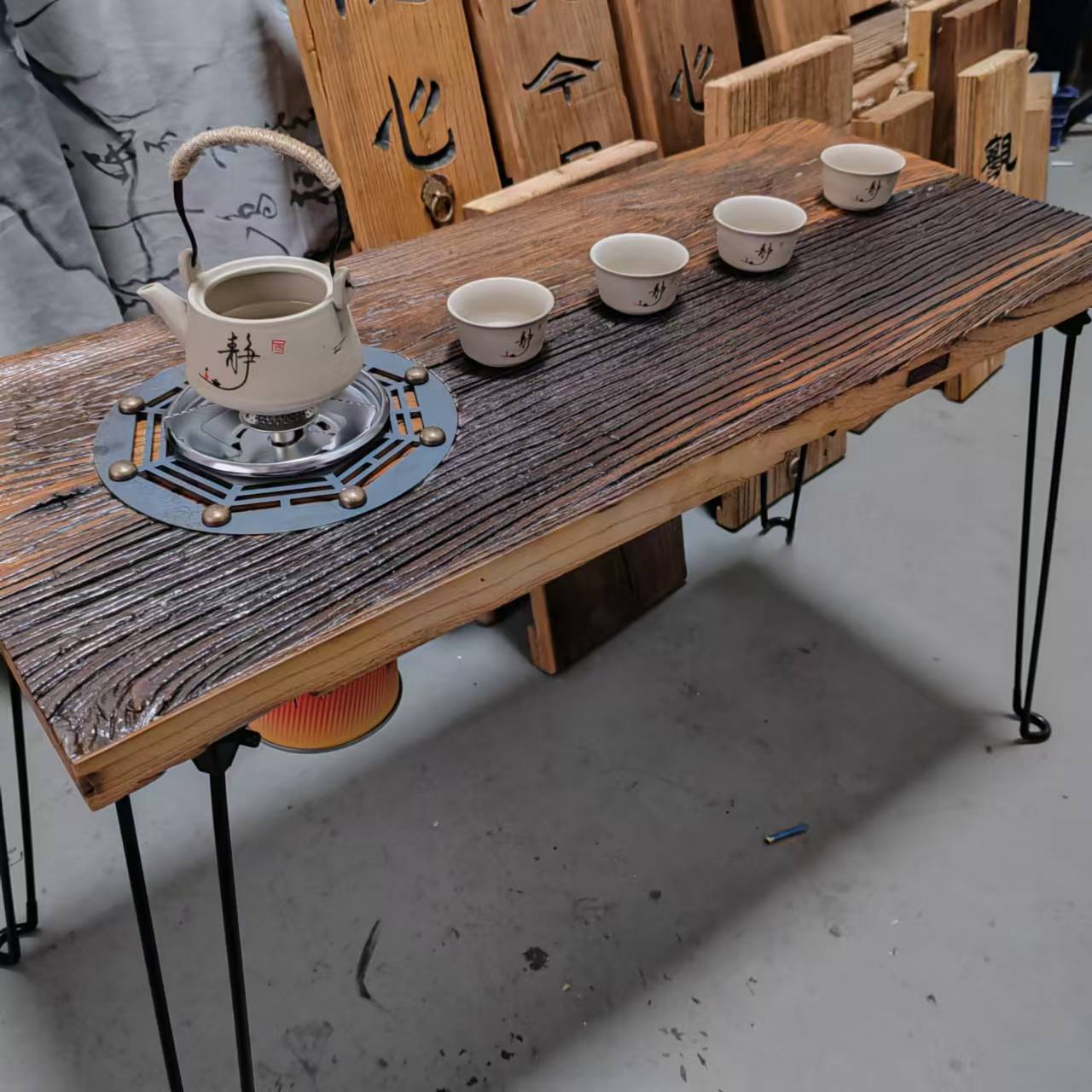 오래된 느릅 나무 요리 차 테이블 피크닉 캠핑 야외 접는 뜨거운 냄비 테이블 공기-탄소 이중 사용 차 테이블 요리 차 테이블