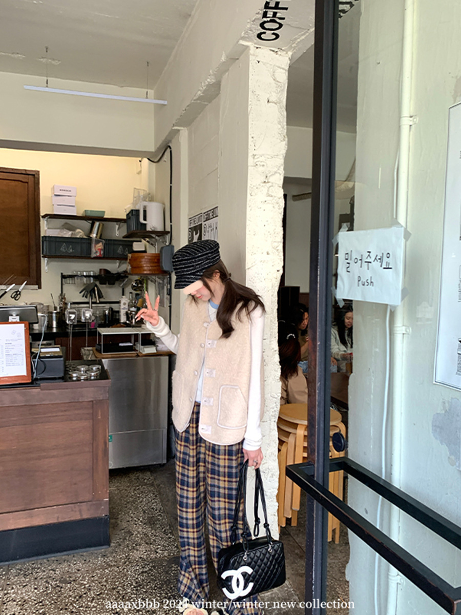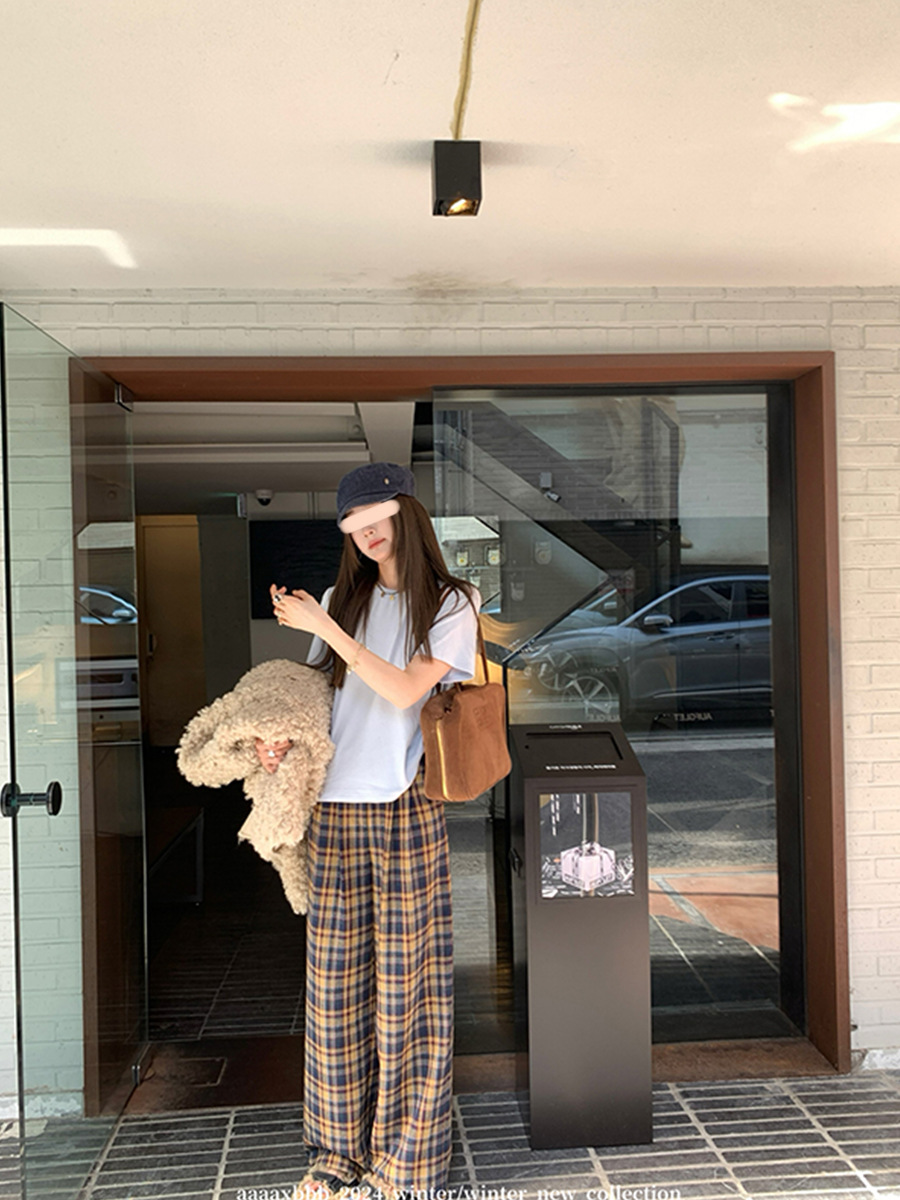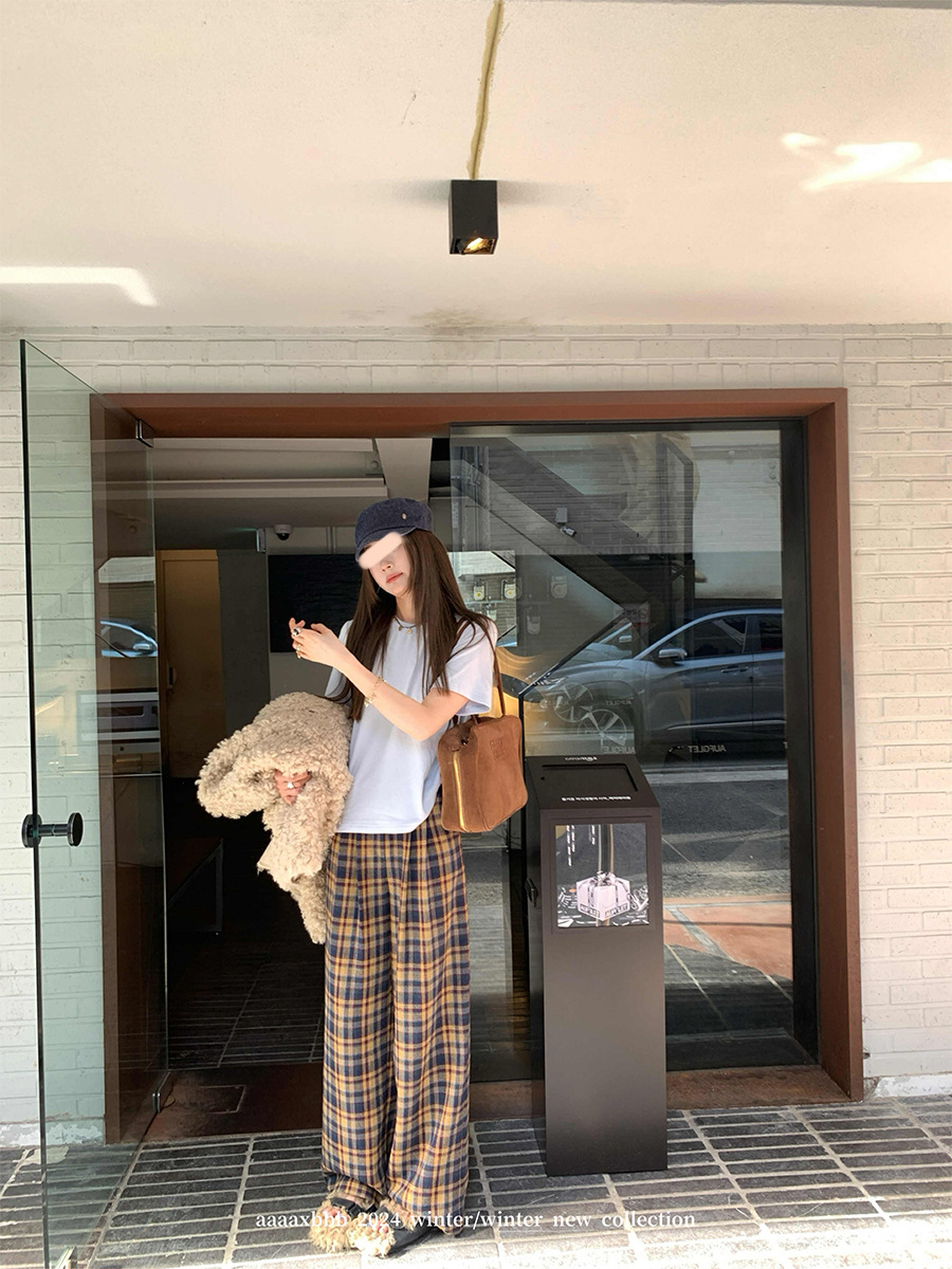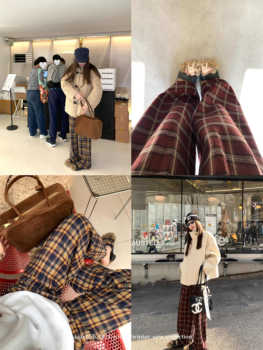 Aaaaxbb 휴일 분위기 울 격자 무늬 바지 느슨한 게으른 스타일 스트레이트 다리 바지 올 매치 캐주얼 바지스토어 가기