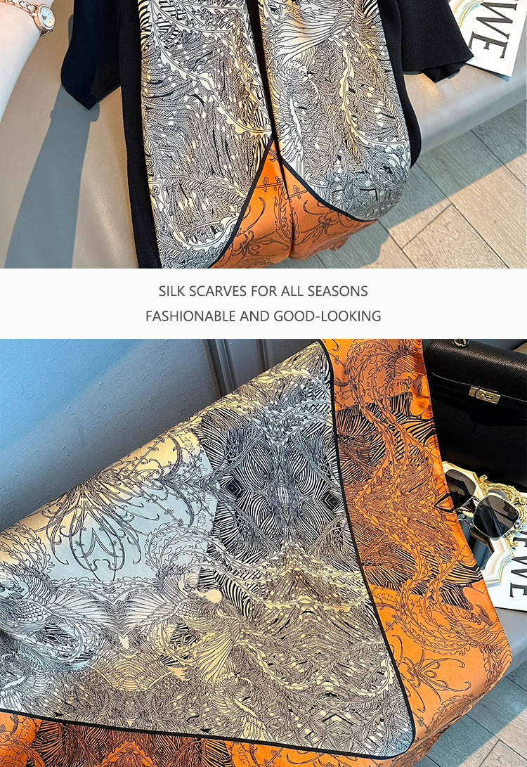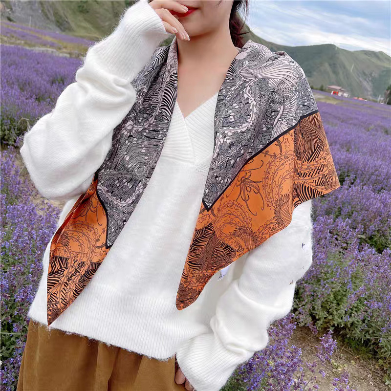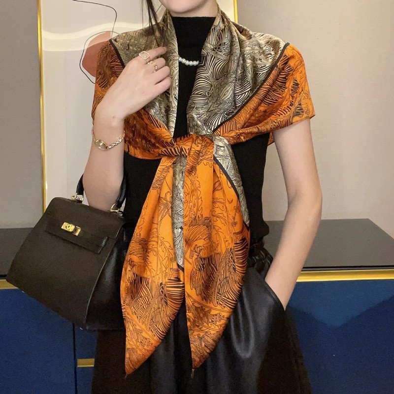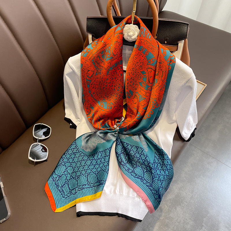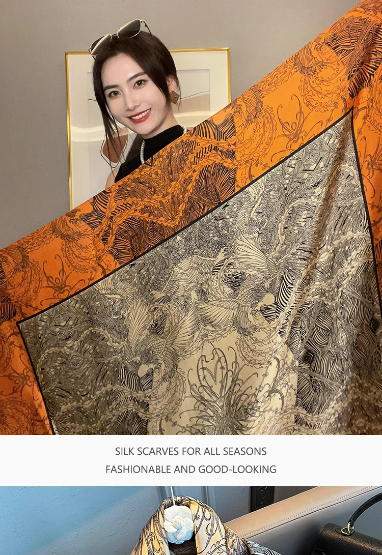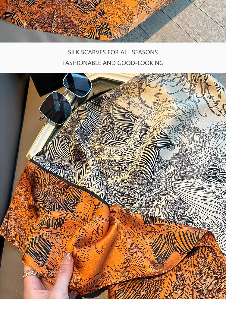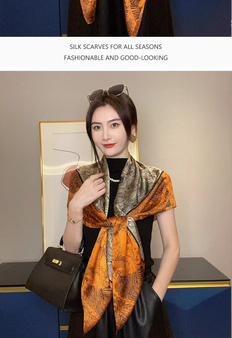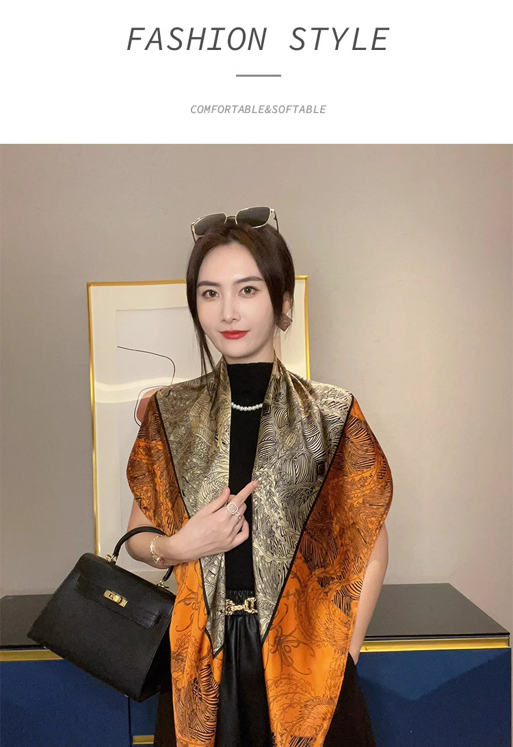 고급스러운 오렌지색 대형 스카프 110 프린트 인조 실크 스카프 여성용 자외선 차단 숄 외출용 어머니 선물스토어 가기