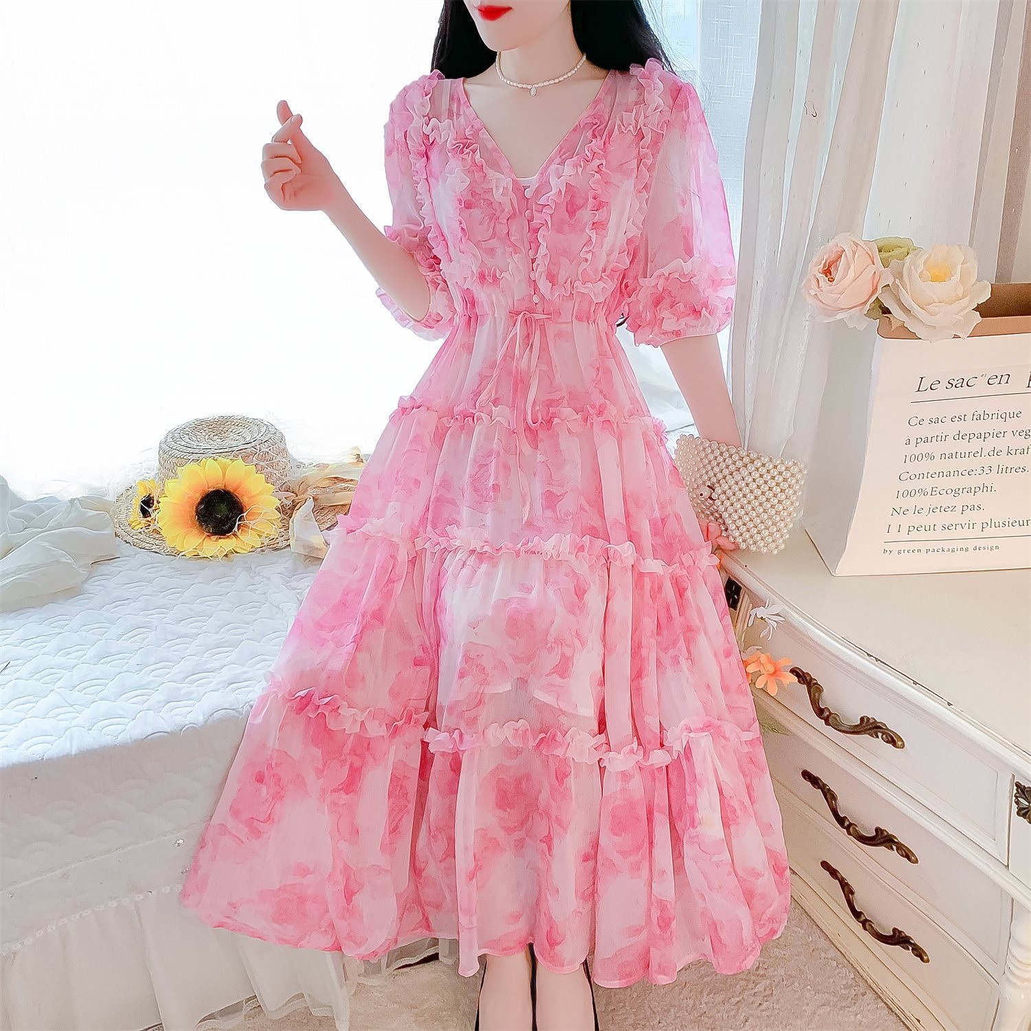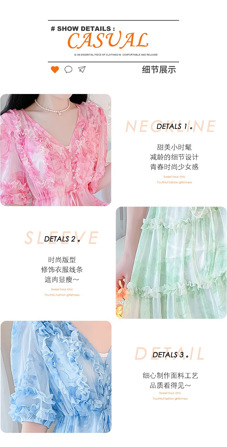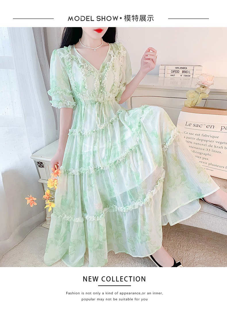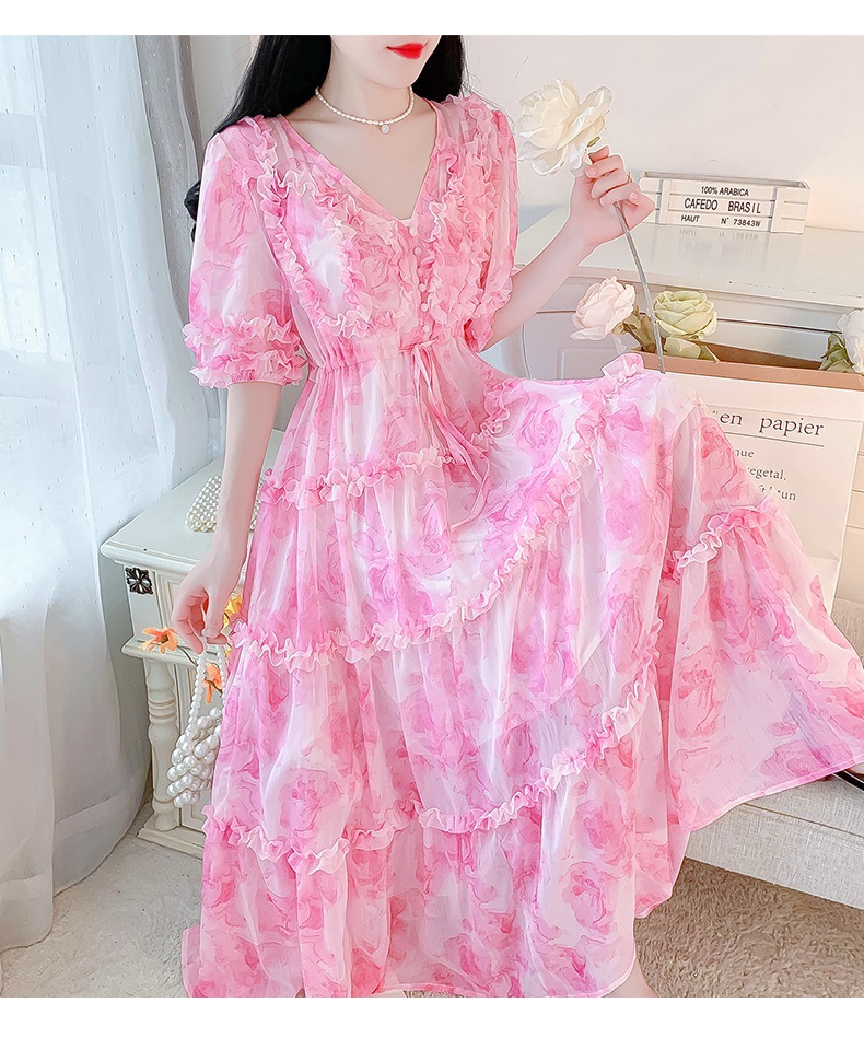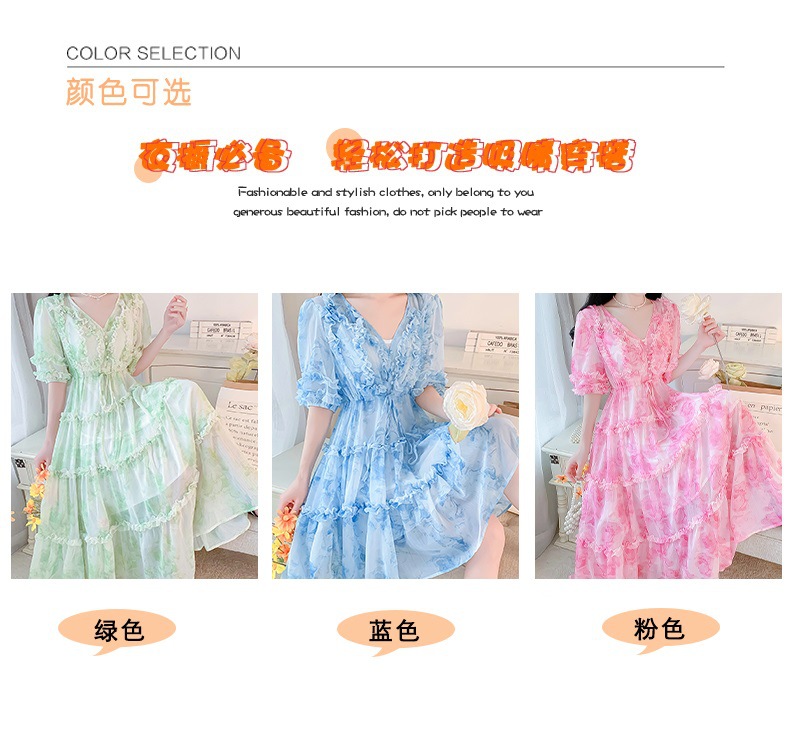 여성을위한 프랑스 부드러운 스타일 v 넥 꽃 드레스 여름 2025 새로운 요정 슈퍼 요정 쉬폰 롱 스커트스토어 가기
