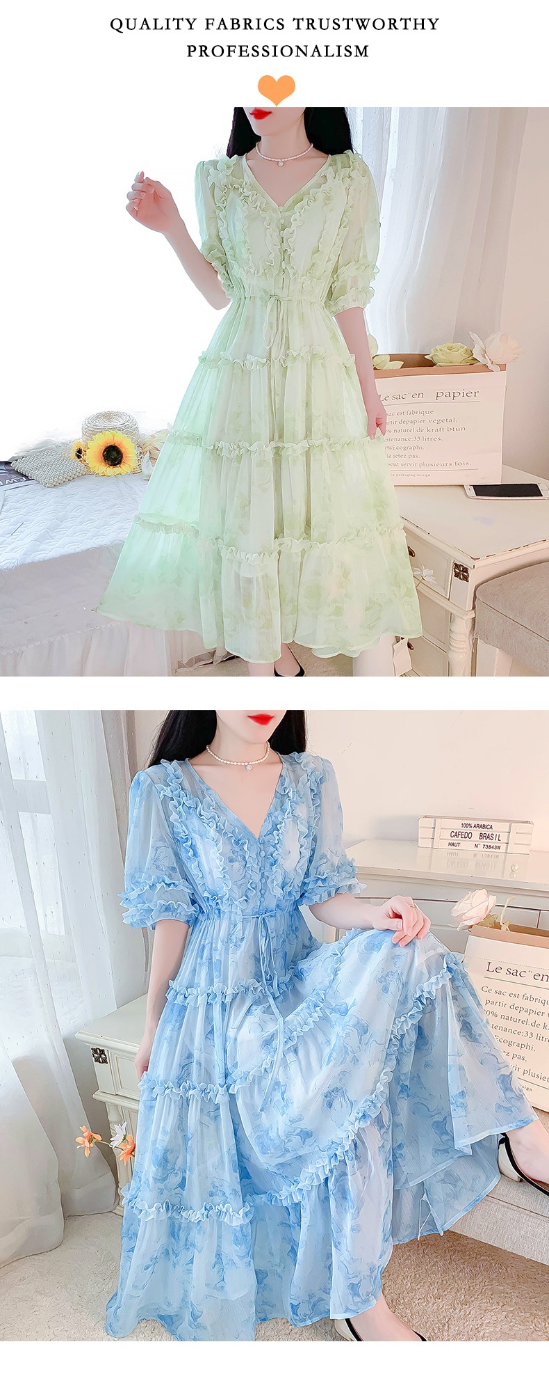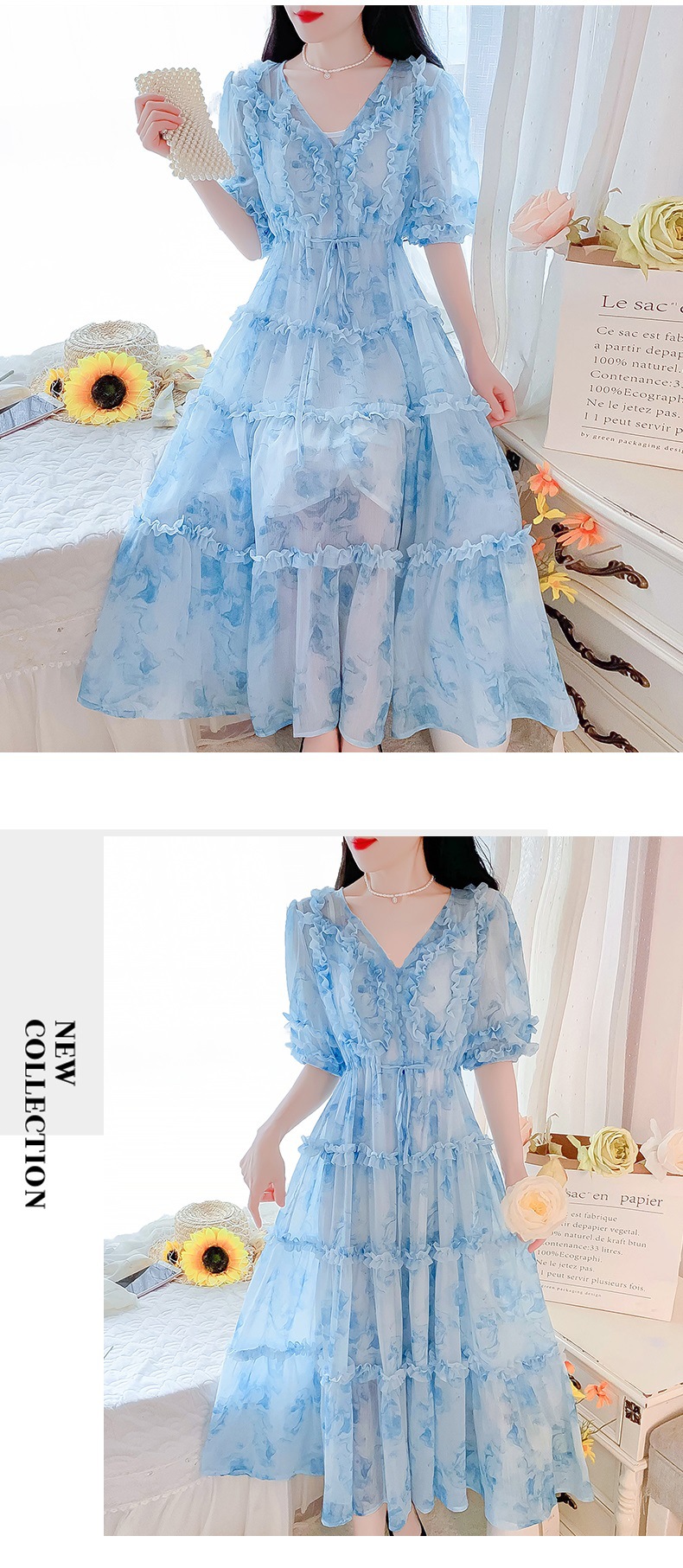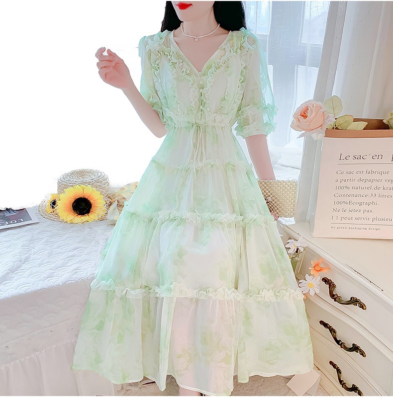 여성을위한 프랑스 부드러운 스타일 v 넥 꽃 드레스 여름 2025 새로운 요정 슈퍼 요정 쉬폰 롱 스커트