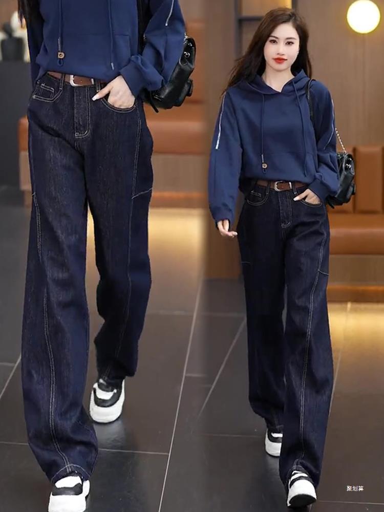 아메리칸 레트로 청바지 여성의 봄과 가을 새로운 바지 높은 허리 슬리밍 좁은 넓은 다리 바지 느슨한 캐주얼 스트레이트 바지