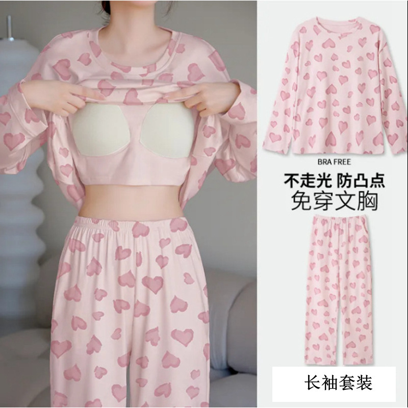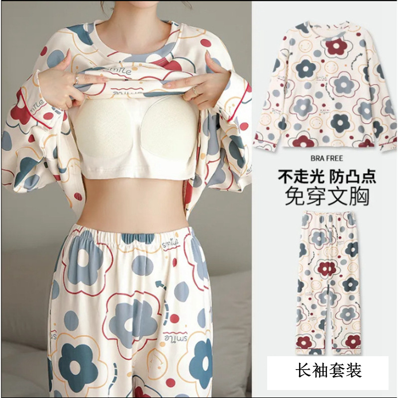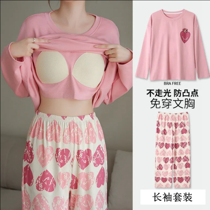잠옷 여성의 가을 모조 면 벨트 가슴 패드 통합 긴 소매 세트 봄과 가을 캐주얼 여성 플러스 사이즈 홈 옷