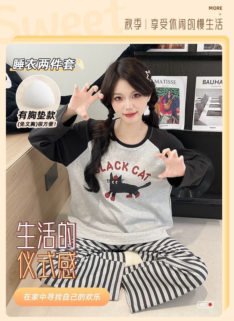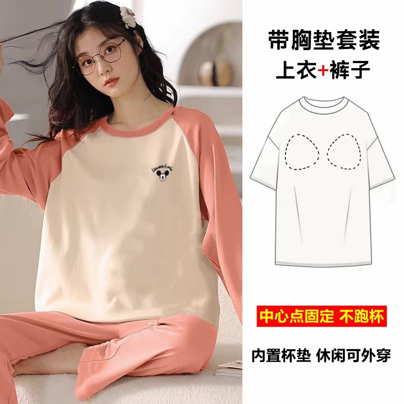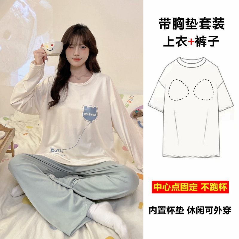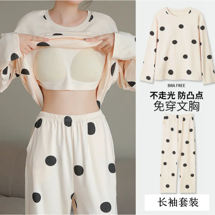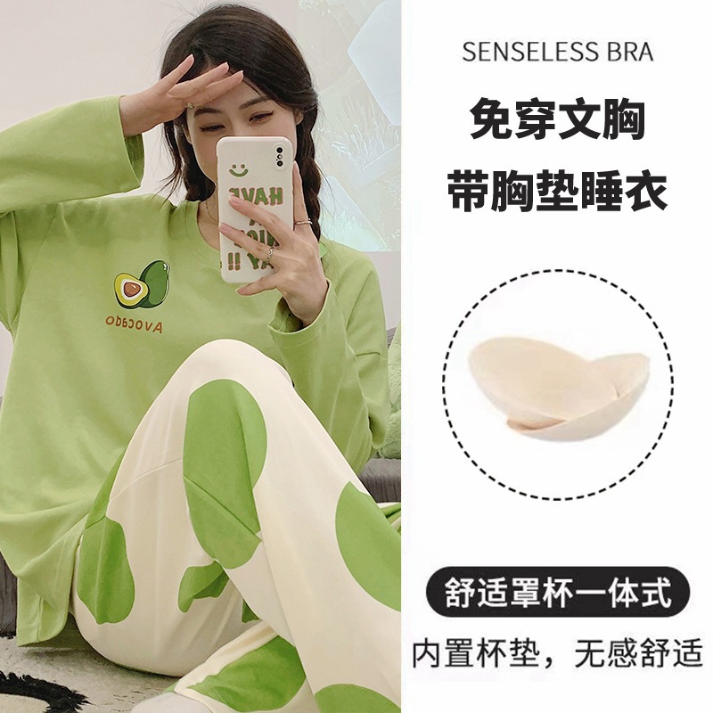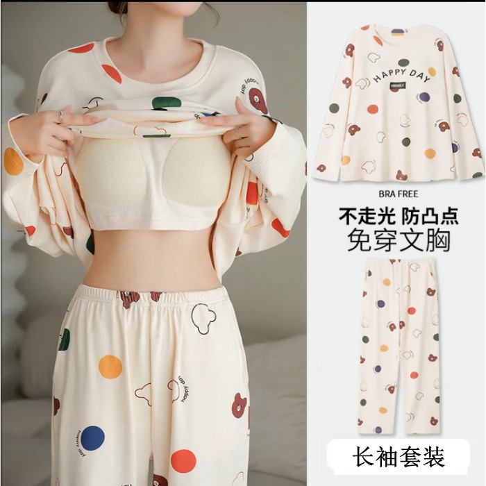 잠옷 여성의 가을 모조 면 벨트 가슴 패드 통합 긴 소매 세트 봄과 가을 캐주얼 여성 플러스 사이즈 홈 옷스토어 가기