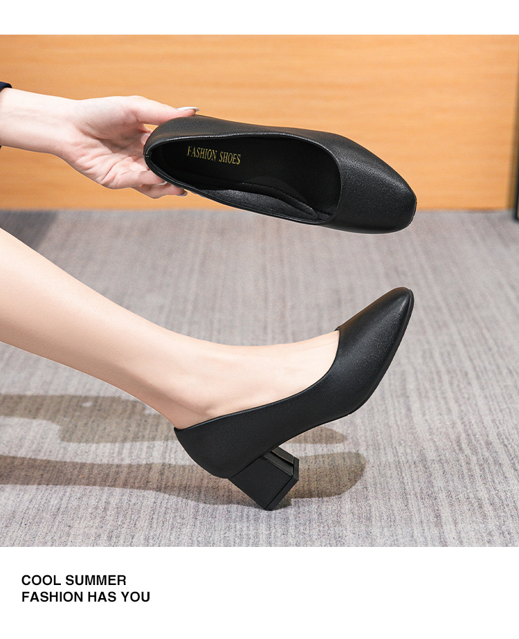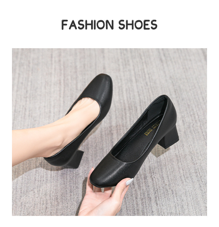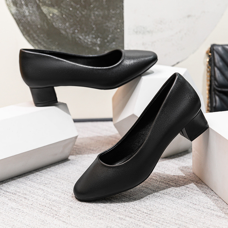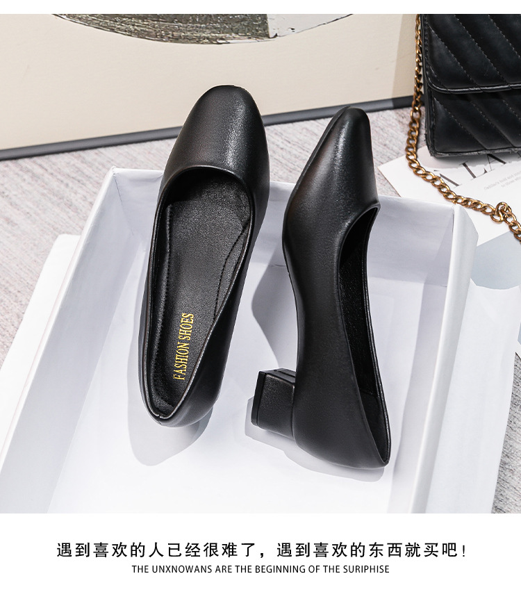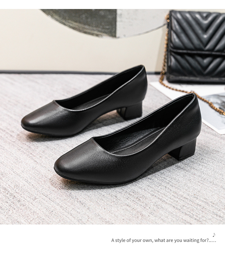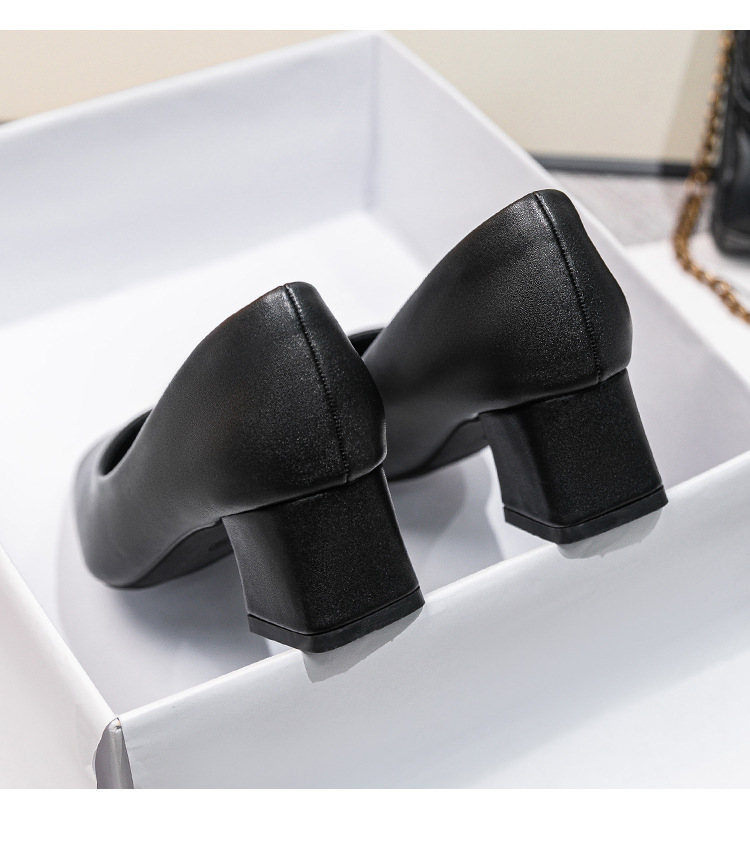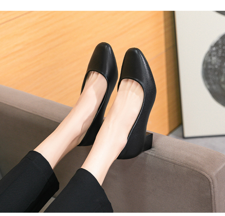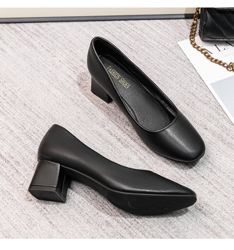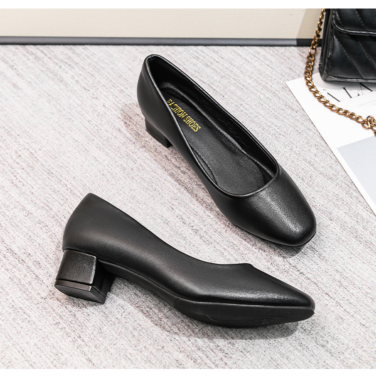 소프트 솔 신발 여성용 얕은 입 가죽 신발 중간 힐 두꺼운 힐 블랙 작업 신발 스퀘어 헤드 오피스 편안한 프론트 데스크