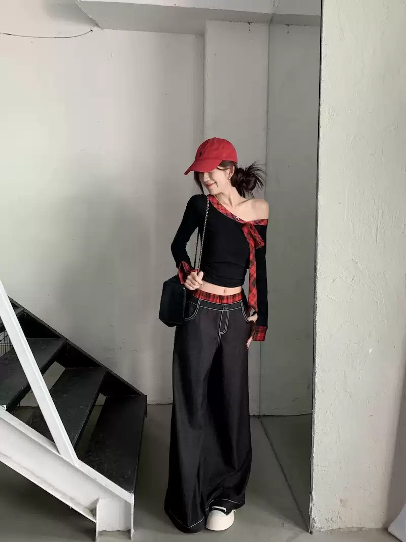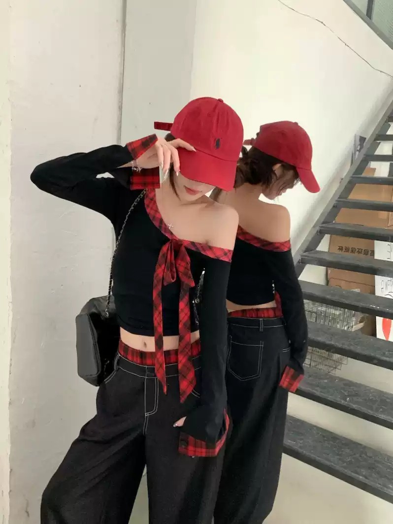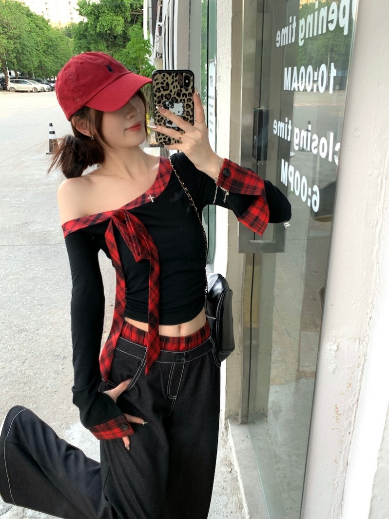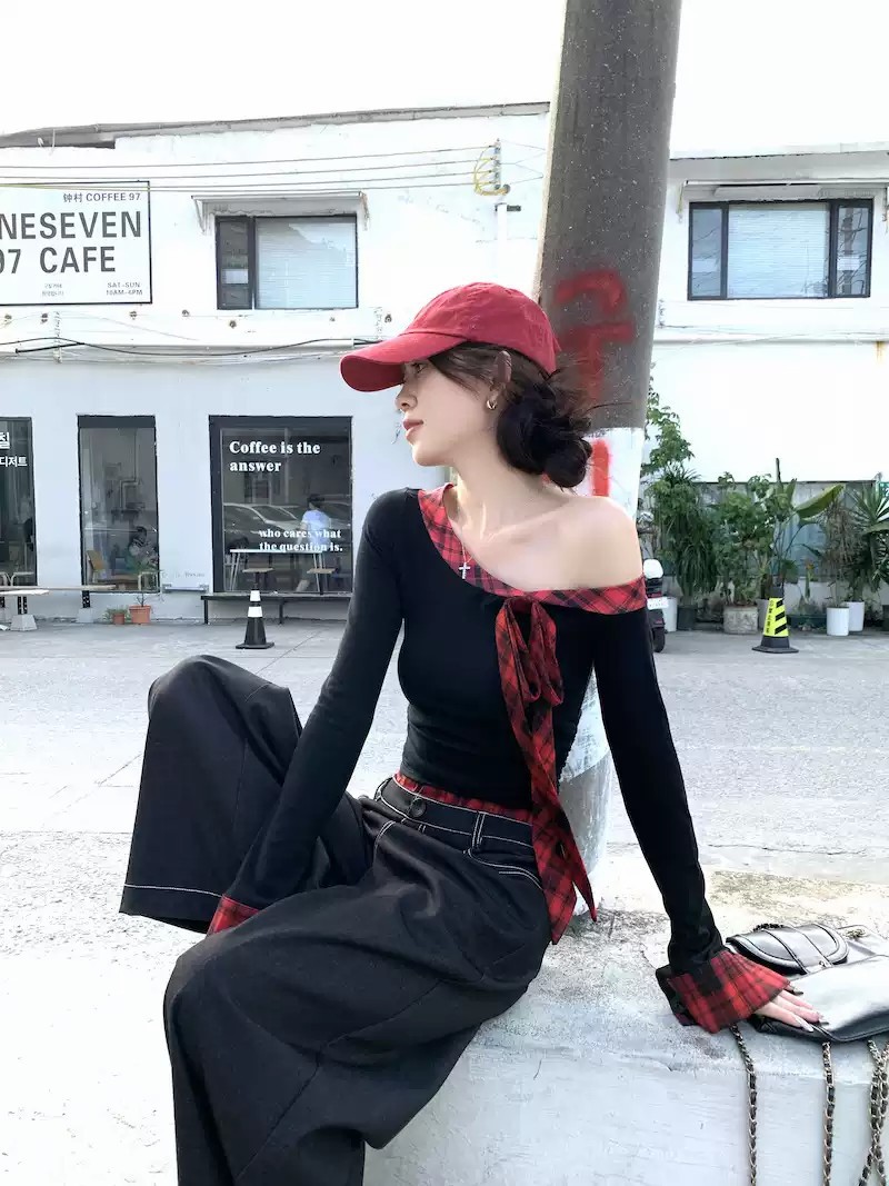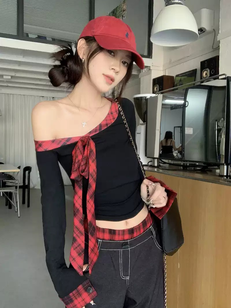 검은 격자 무늬 바느질 활 날씬한 어깨 티셔츠 여성용 가을과 겨울 달콤한 스파이스 소녀 어깨베이스 셔츠스토어 가기
