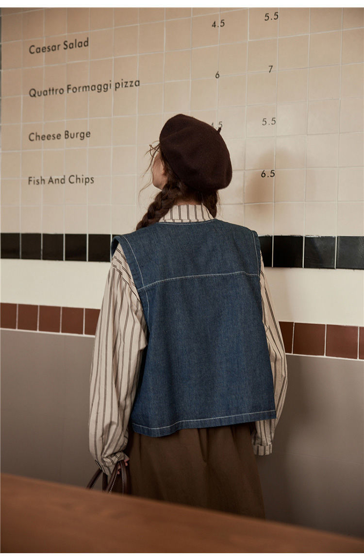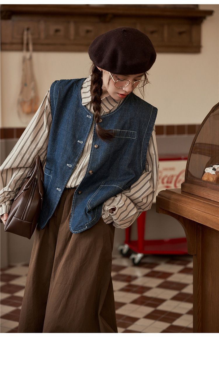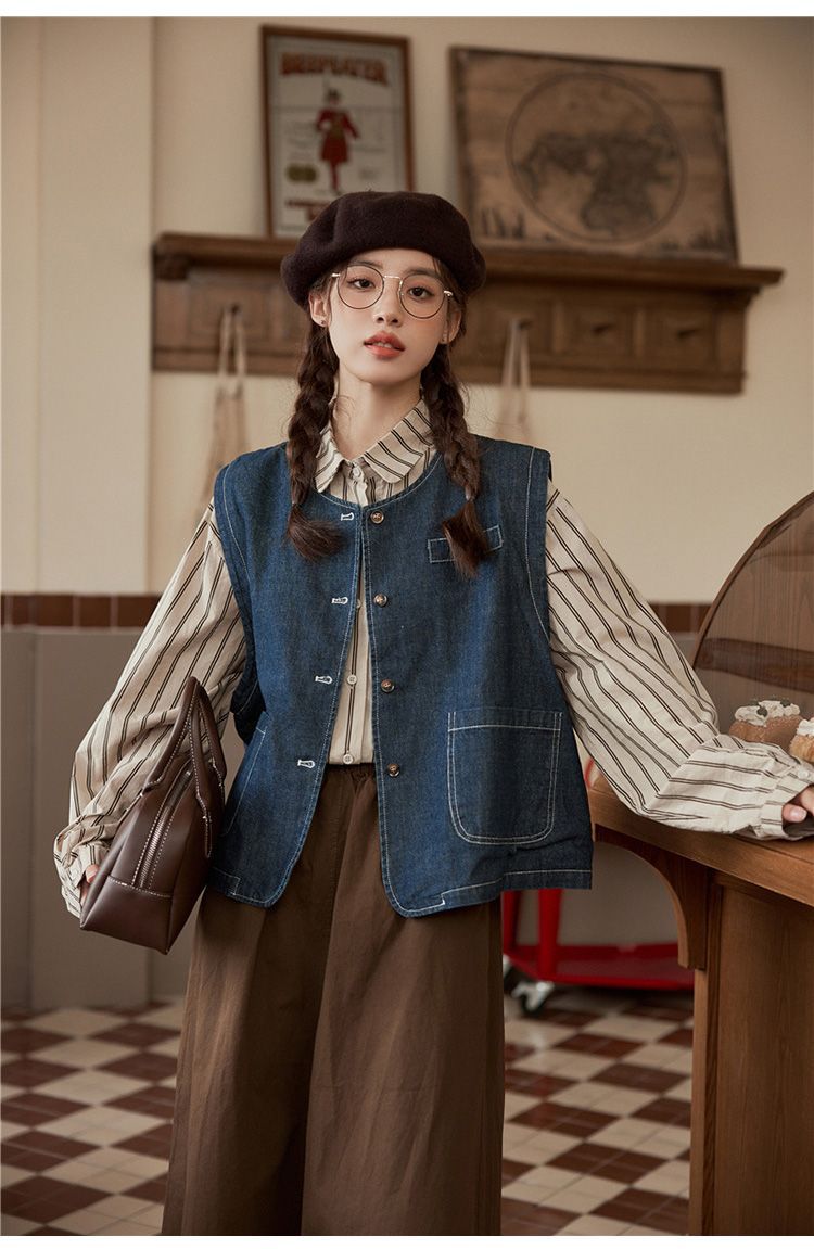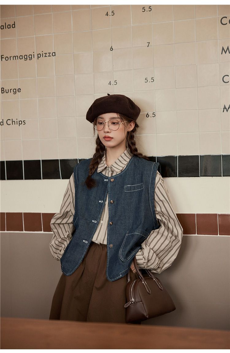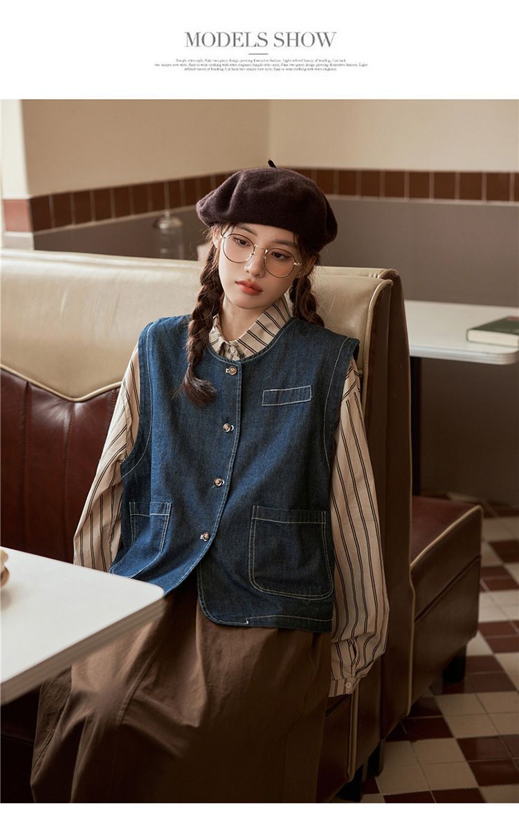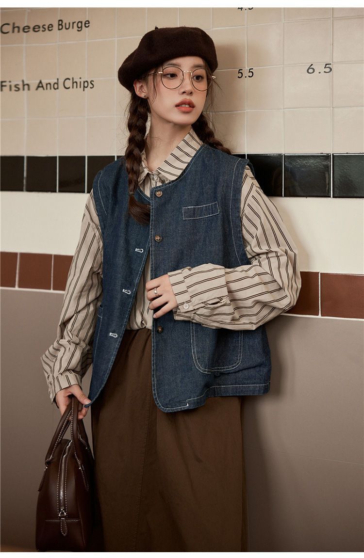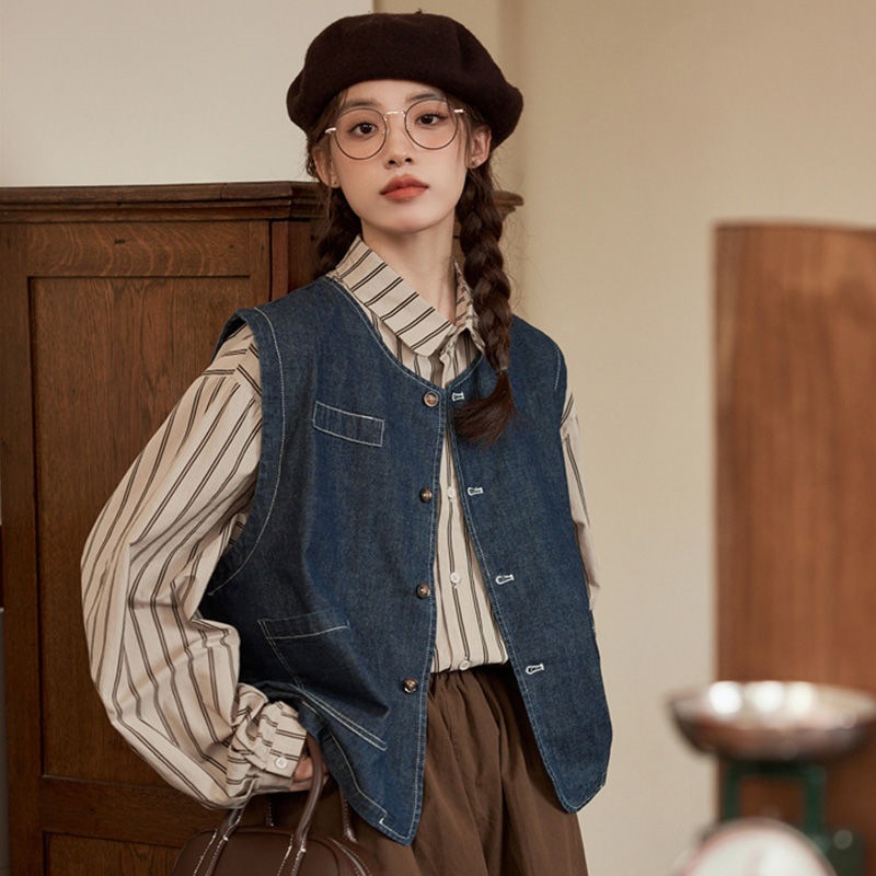 일본 빈티지 데님 조끼 조끼 재킷 여성 가을 2024 새로운 스타일 겹침 셔츠 조끼스토어 가기