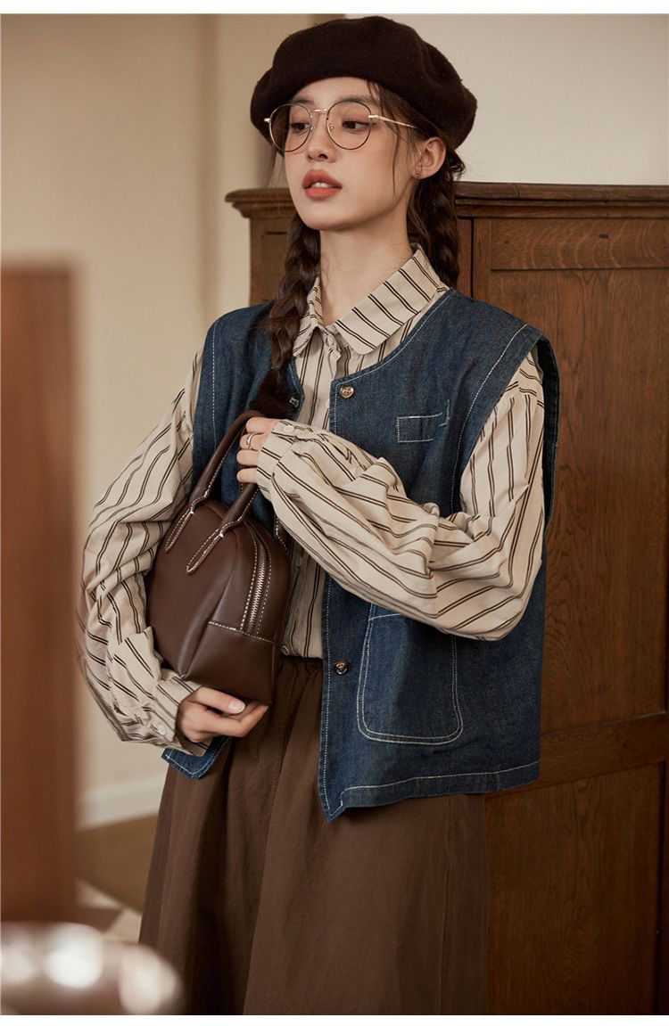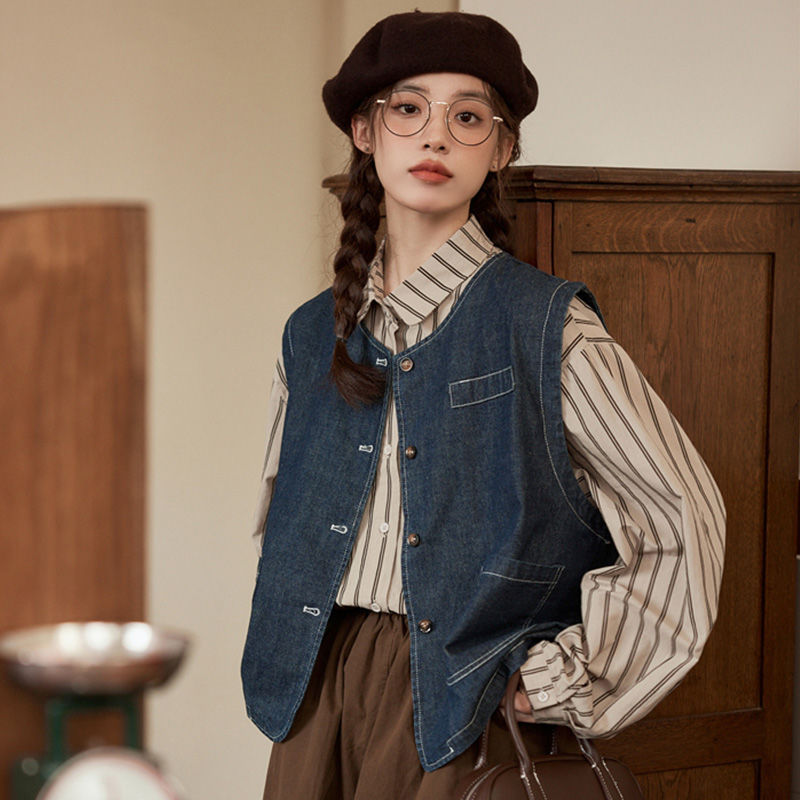 일본 빈티지 데님 조끼 조끼 재킷 여성 가을 2024 새로운 스타일 겹침 셔츠 조끼