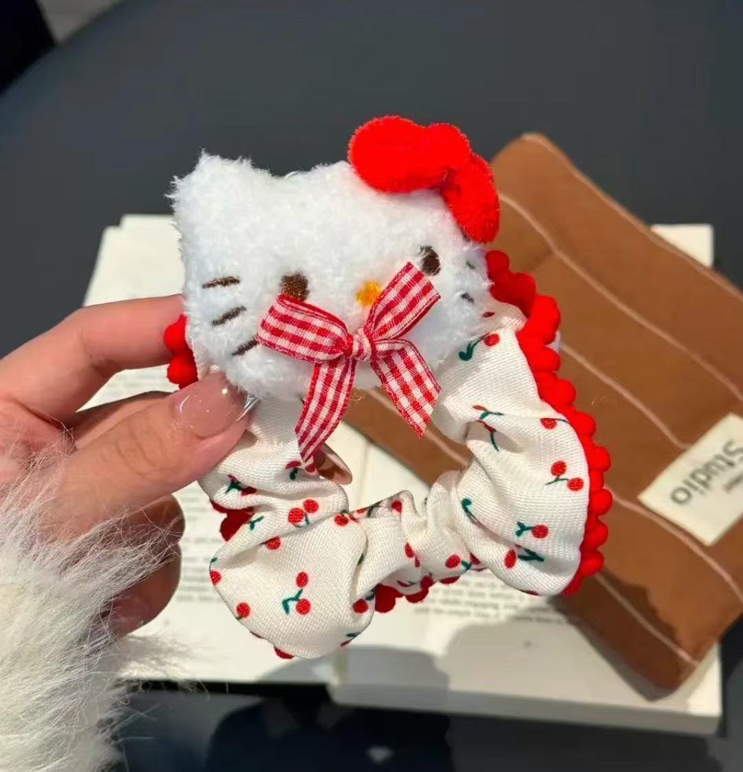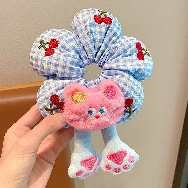 • 7056 카툰 플라워 힙 헤어 타이 - 블루 체크 체리 고양이