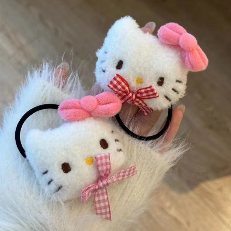 • 7056 카툰 플라워 힙 헤어 타이 - 화이트 고양이 핑크 체크