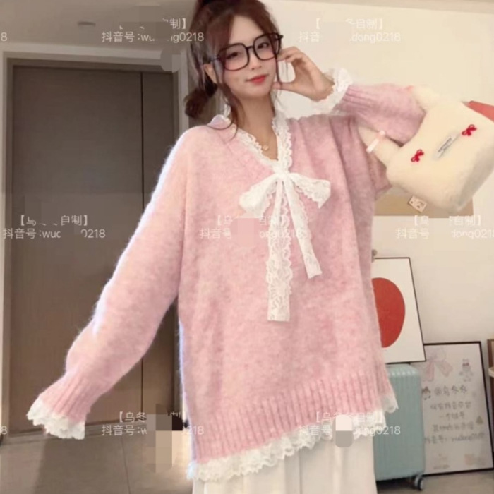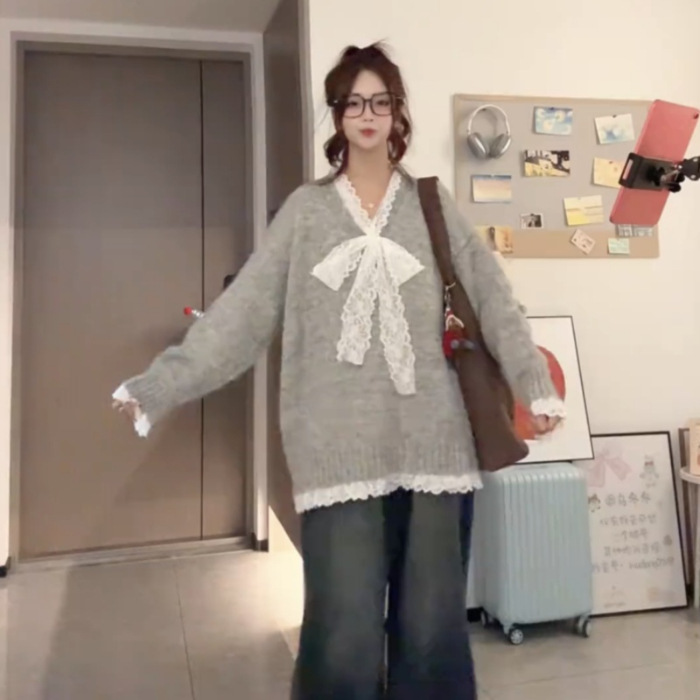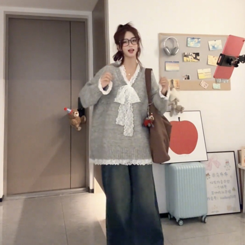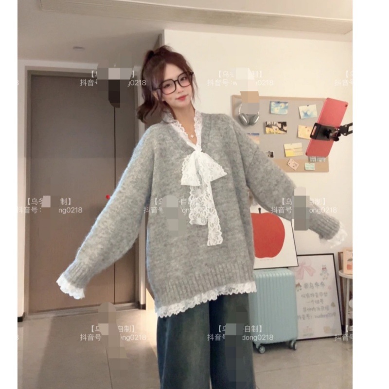 法式设计V领蕾丝边拼接假两件毛衣女秋冬新款加厚慵懒风套头上衣스토어 가기