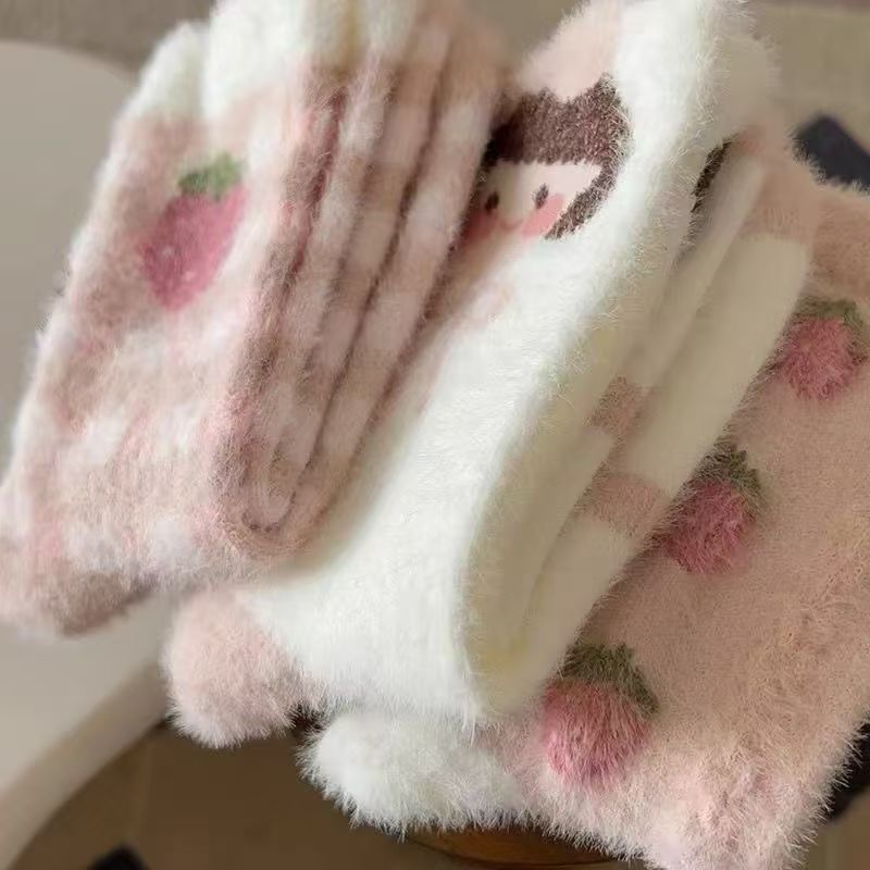 토끼 벨벳 양말 여성 가을과 겨울 두꺼운 따뜻한 수면 양말 바닥 양말 봉제 벨벳 부드러운 핑크 딸기 소녀 귀여운