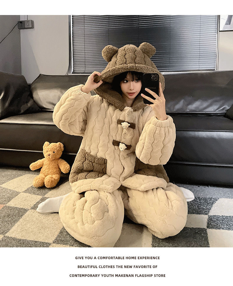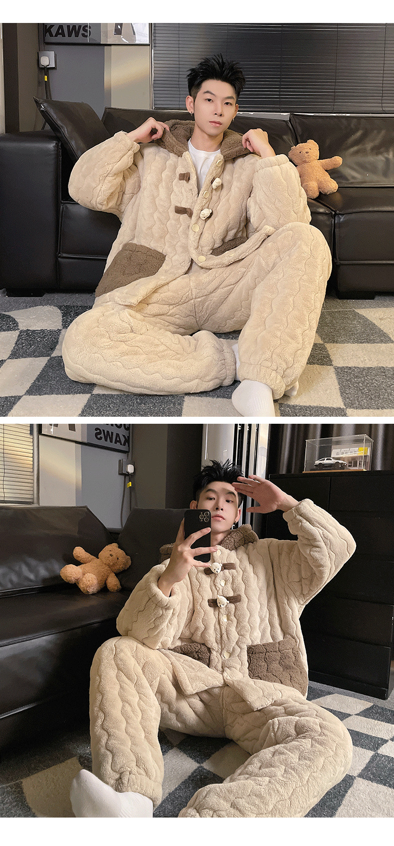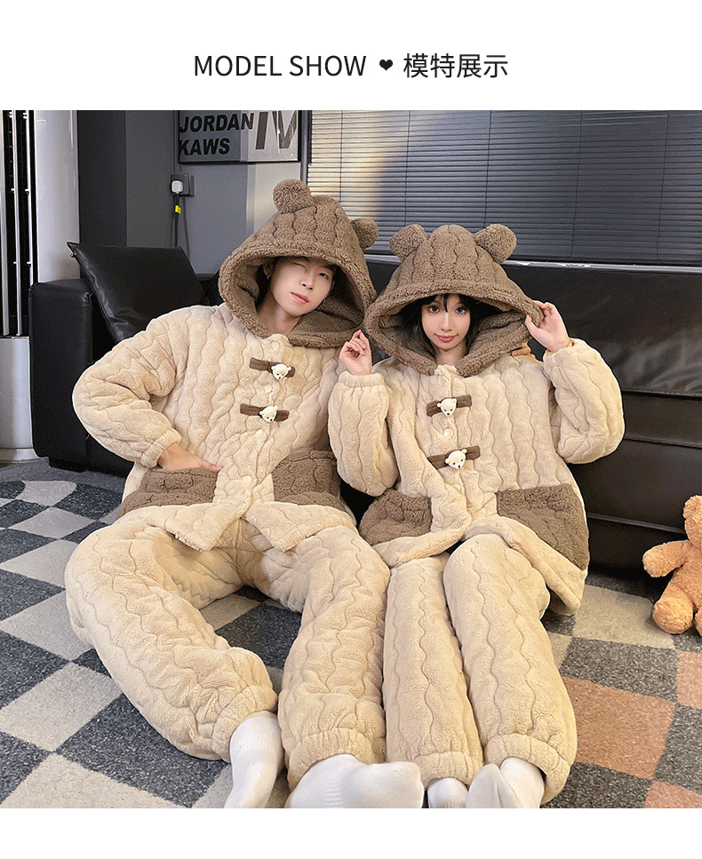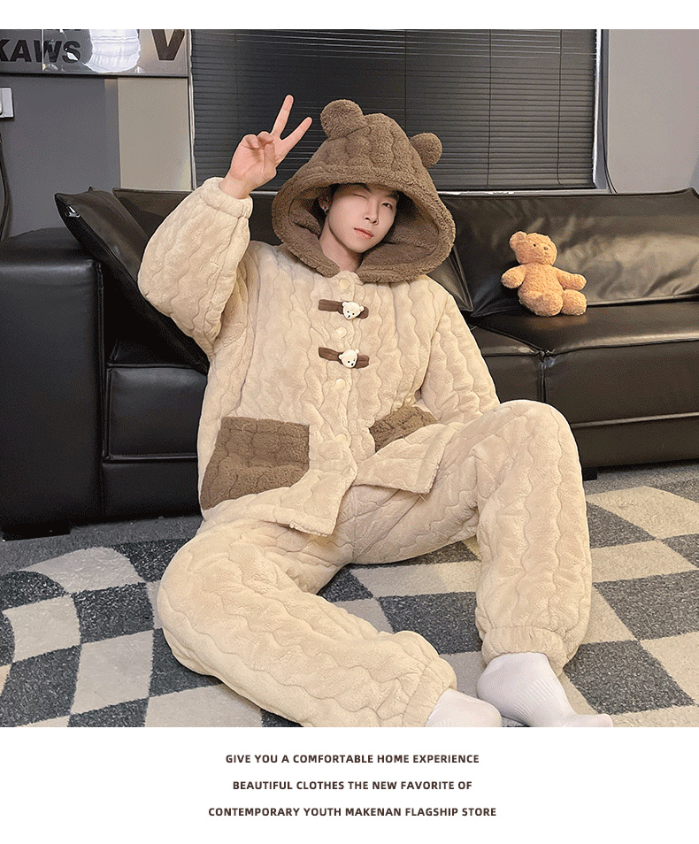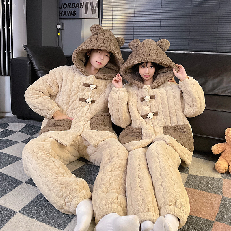 산호 양털 커플 잠옷 가을과 겨울 3 층 두꺼운 면화 세트 새로운 숙녀 겨울 따뜻한 집 옷 남성스토어 가기