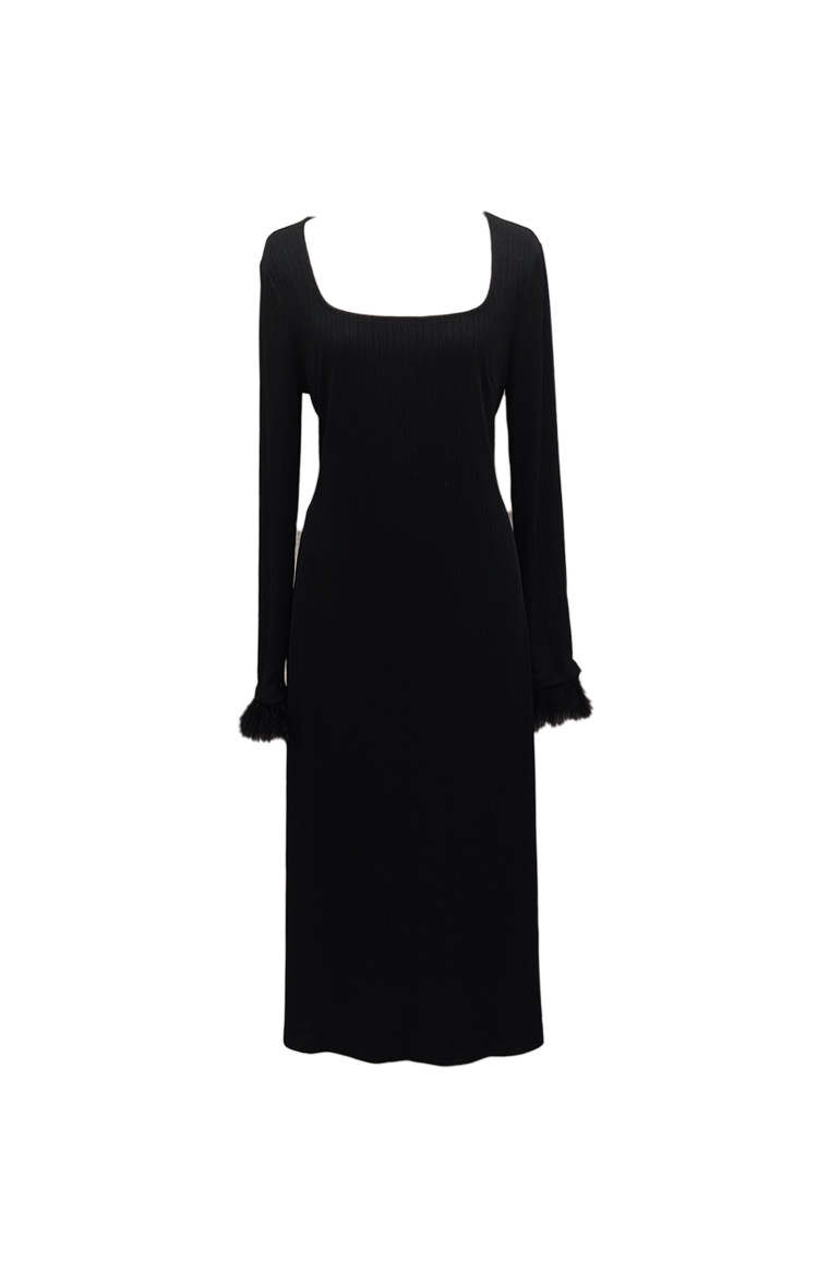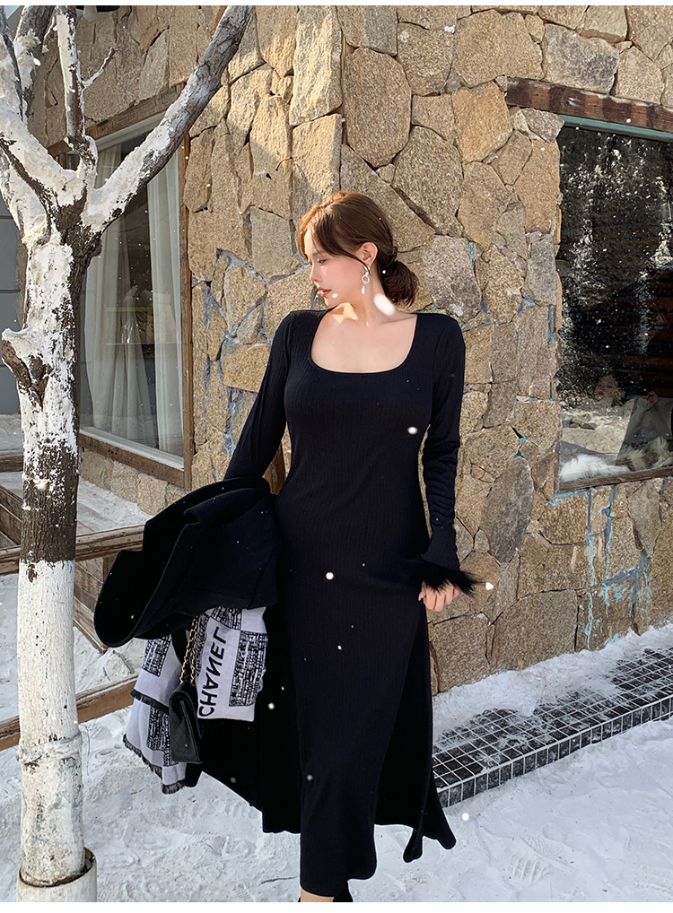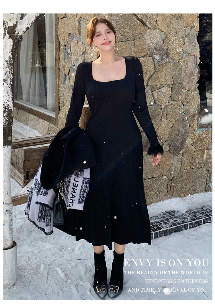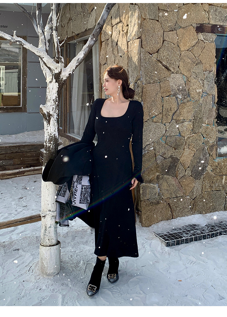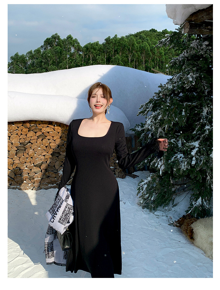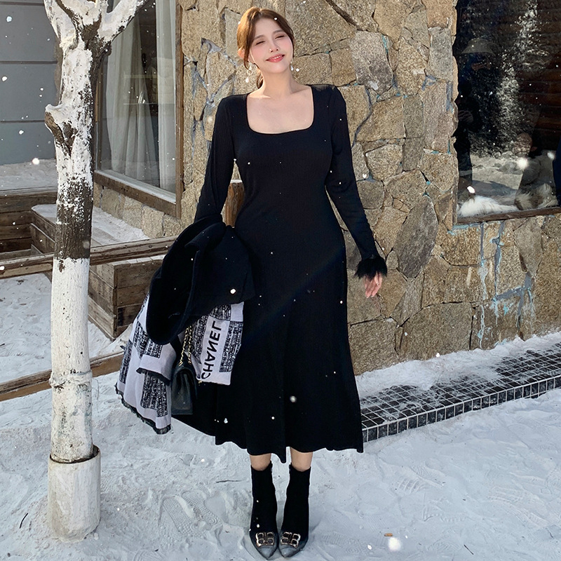 플러스 사이즈 여성 하이 엔드 프랑스 레트로 스퀘어 넥 슬림 내부 기지 원피스 통통녀 가을과 겨울 긴 원피스 1994