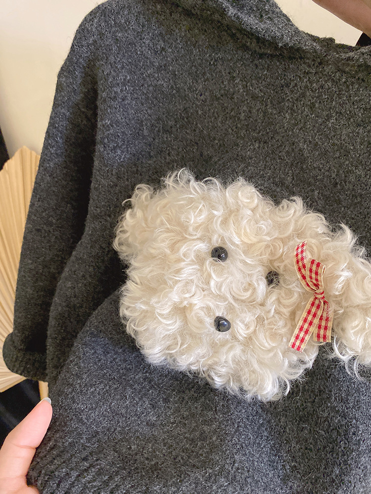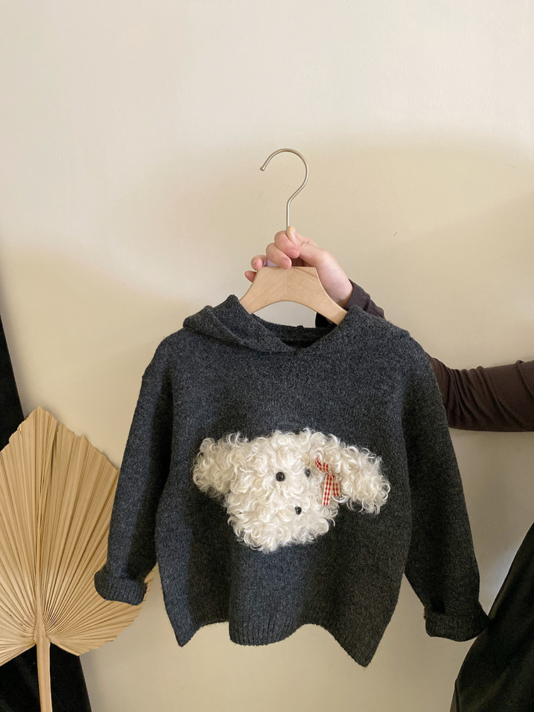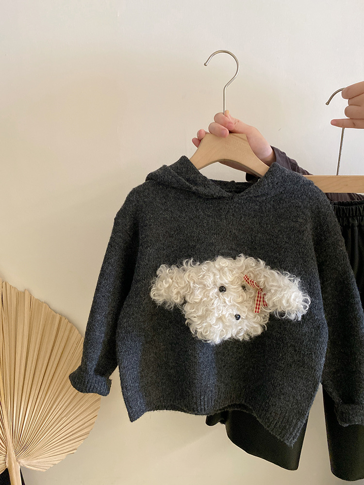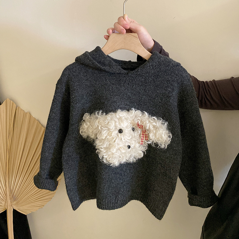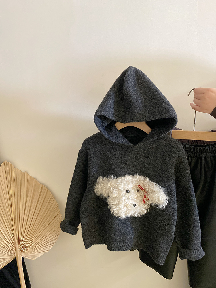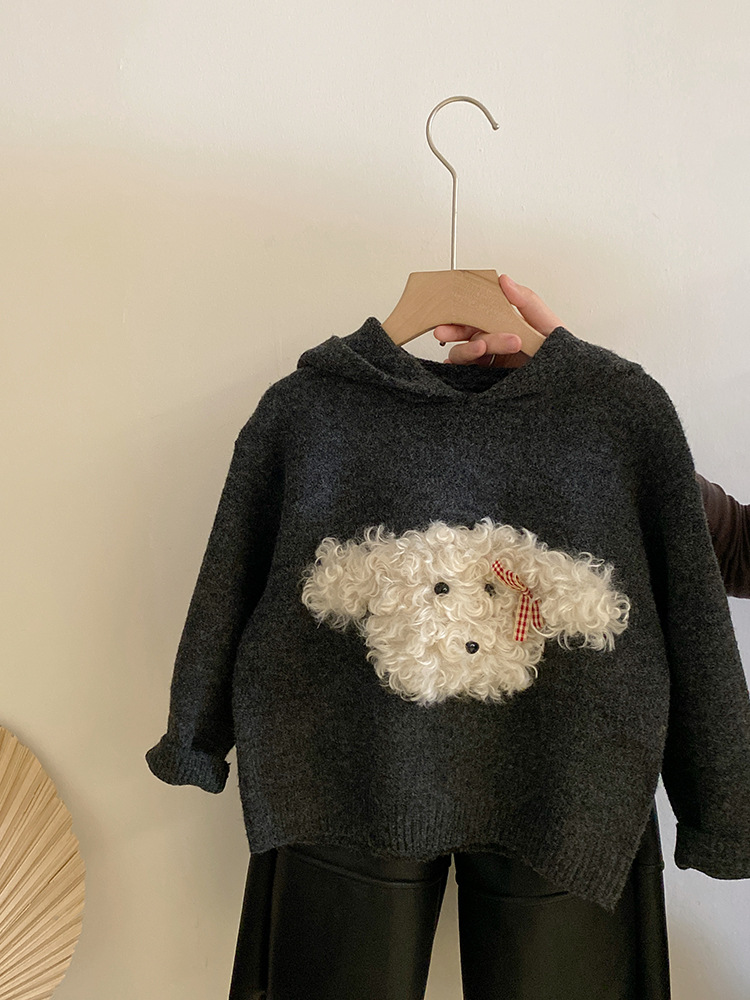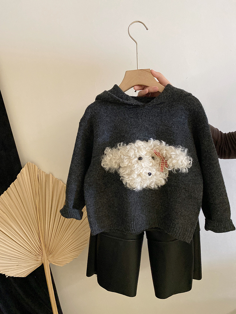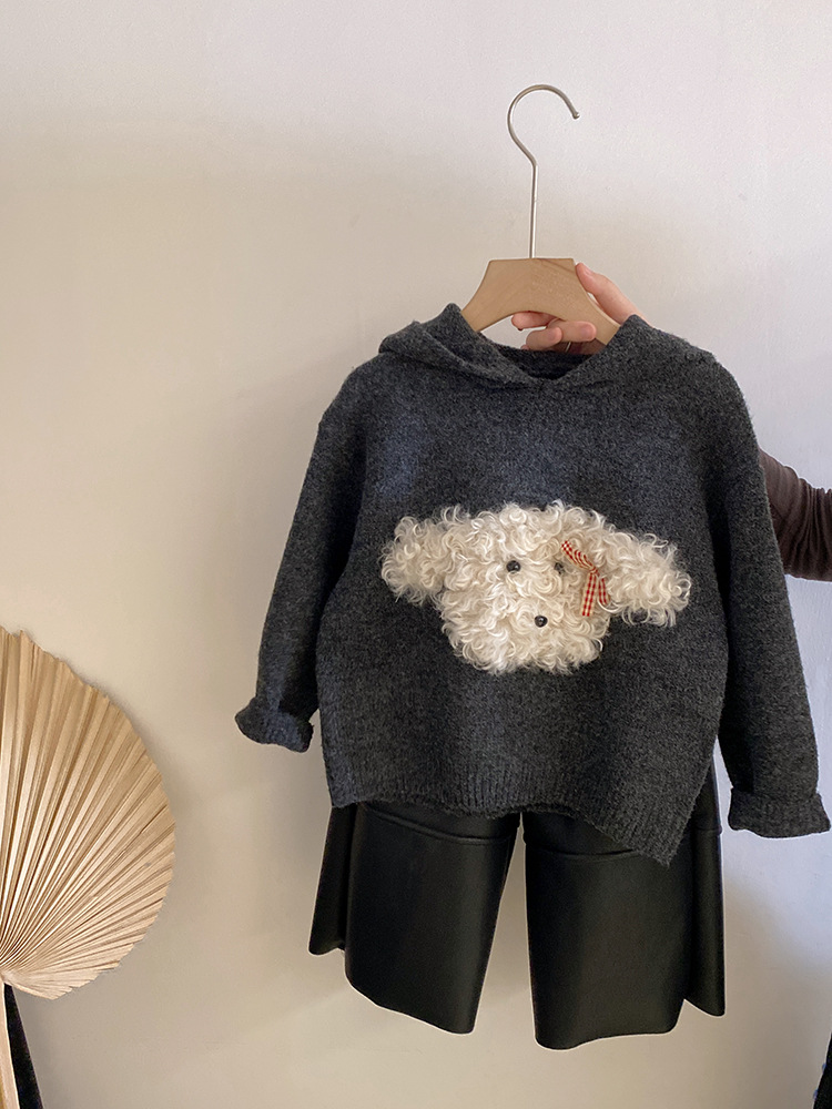 소녀 한국어 버전의 만화 곱슬 강아지 후드 니트 스웨터 2024 가을과 겨울 새로운 기모 따뜻한 가죽 바지 세트스토어 가기