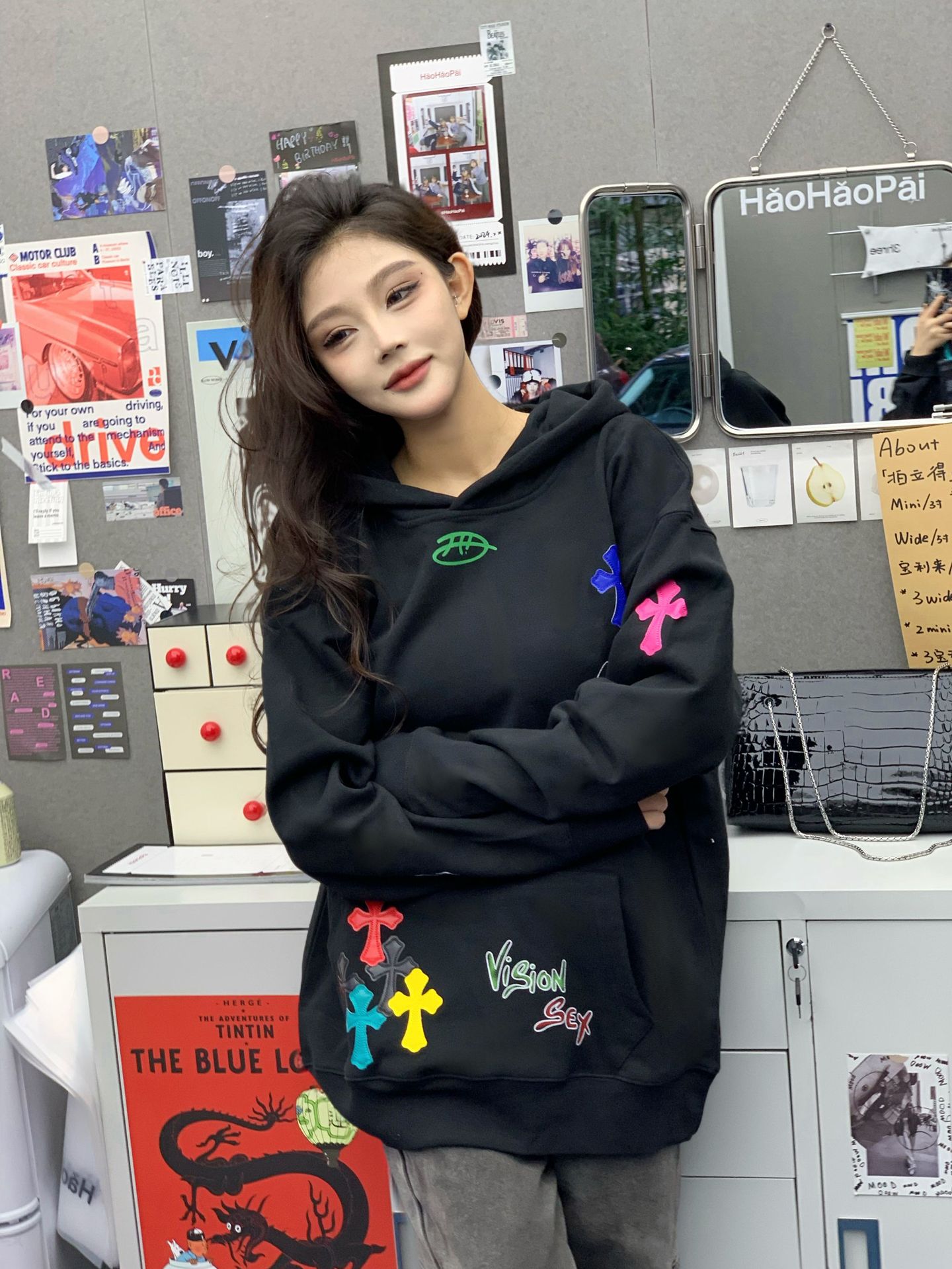 24SS 새로운 크롬 하트 다채로운 크로스 필 산스크리트어 손으로 그린 낙서 후드 커플
