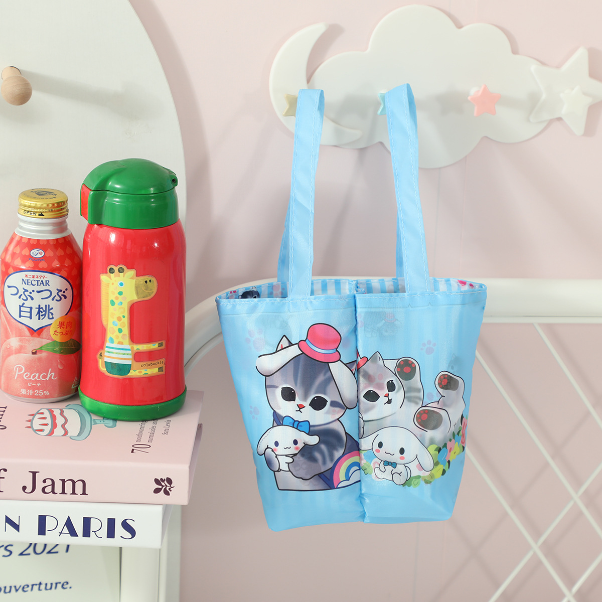 상어 고양이 만화 귀여운 이중컵 일체형 휴대용 밀크티 가방 접이식 보관 음료 가방스토어 가기