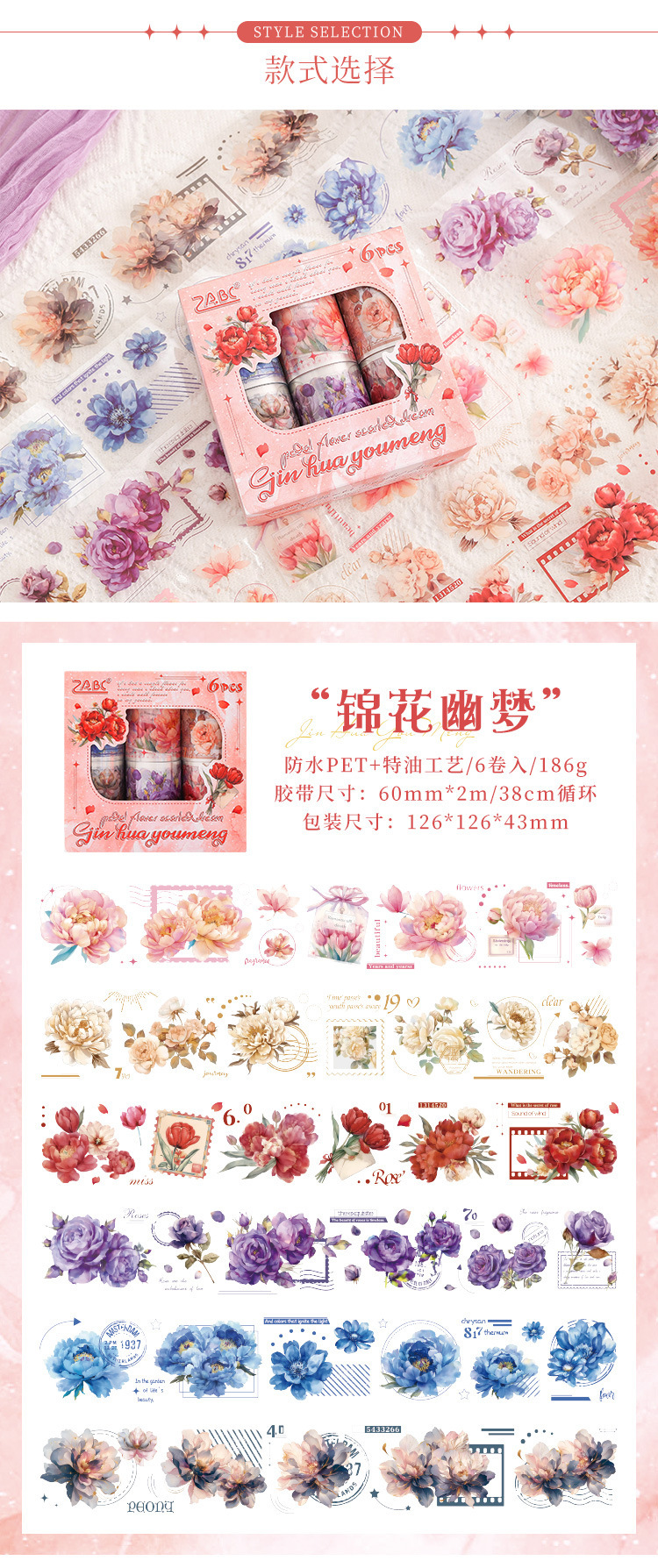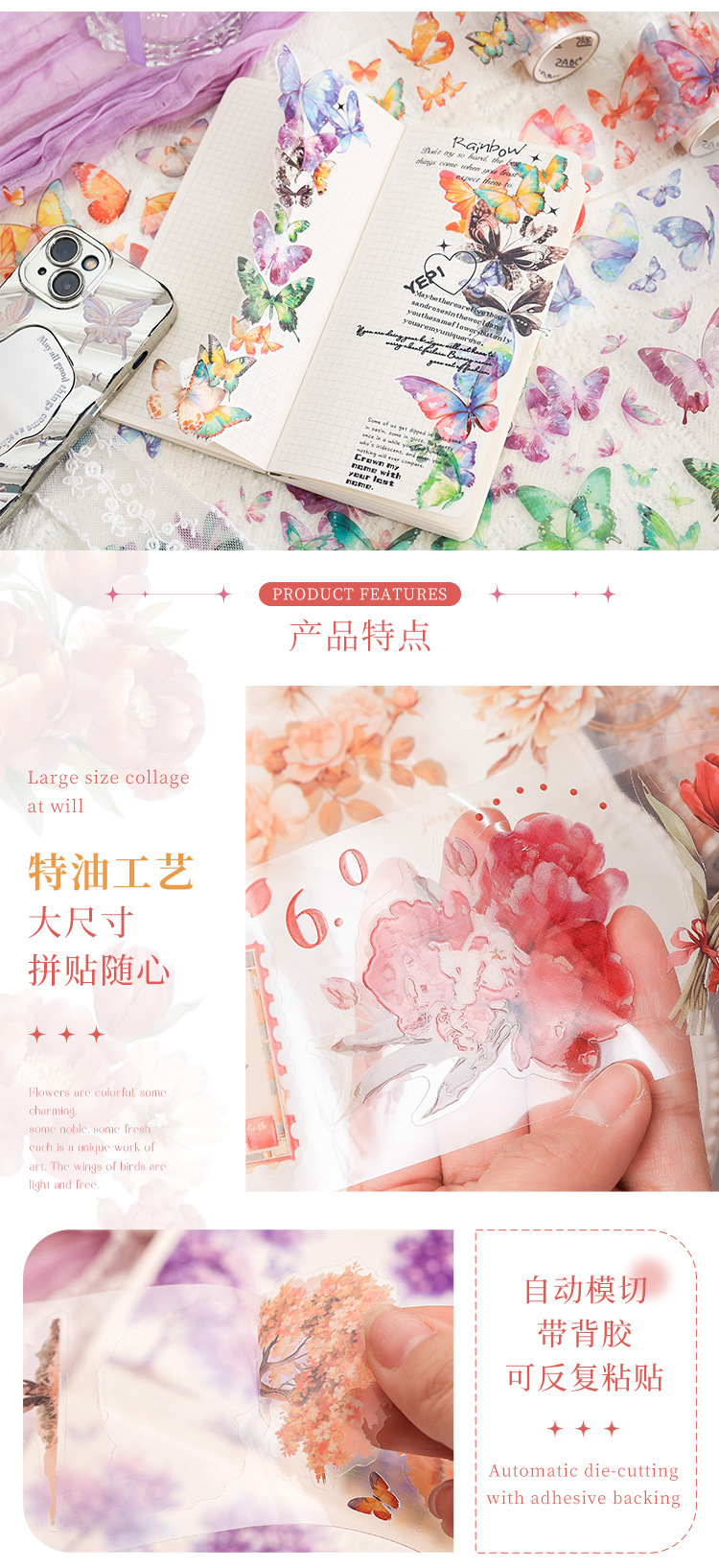 플랩 플라워 페이 Meng 특수 오일 방수 애완 동물 테이프 세트 상자 DIY 손 계정 일기 스티커 국경 간 풍경 꽃 나비 스티커스토어 가기