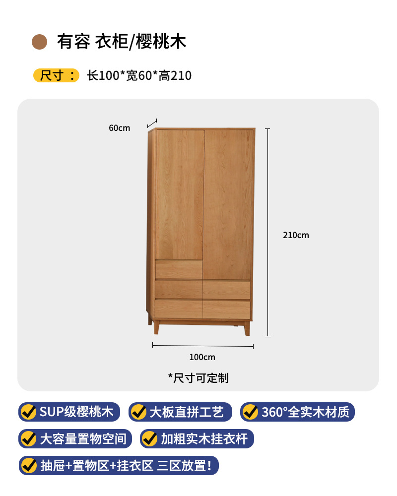 • 1M 원목 양문형 옷장 | 벚나무 + 문 2개 + 조립