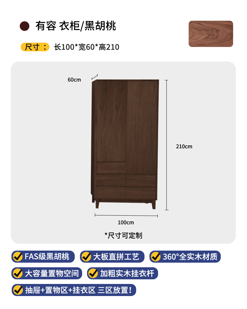 • 1M 원목 양문형 옷장 | 블랙 월넛 + 도어 2개 + 조립