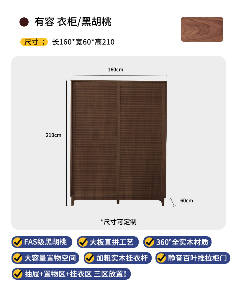 • 1.6M 블라인드 슬라이딩 도어 옷장 | 블랙 월넛 + 도어 2개 + 조립품 |