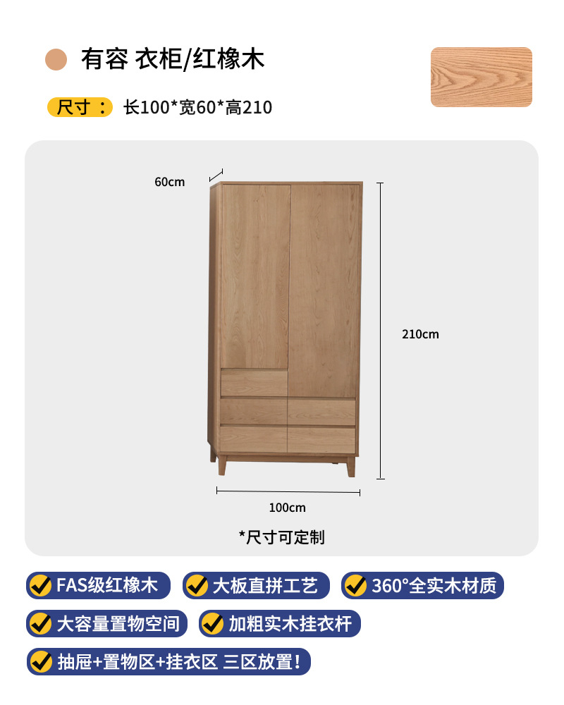 • 1M 원목 양문형 옷장 | 레드오크 + 도어 2개 + 조립