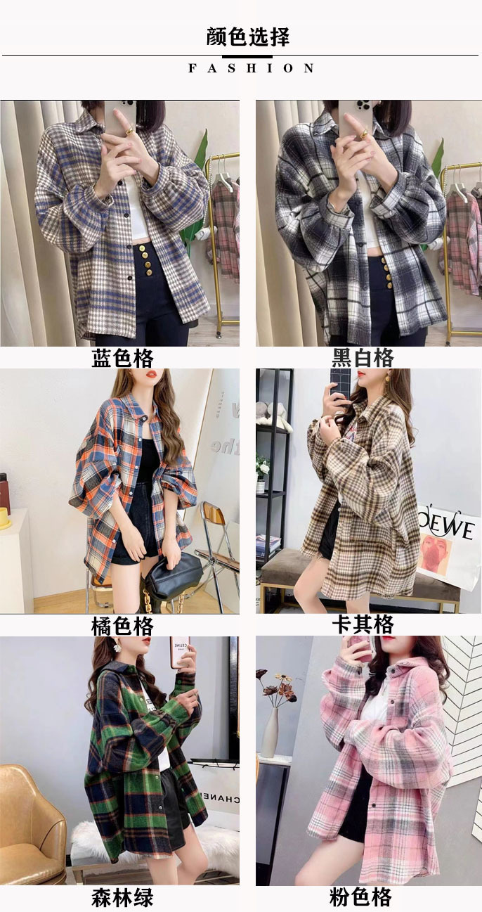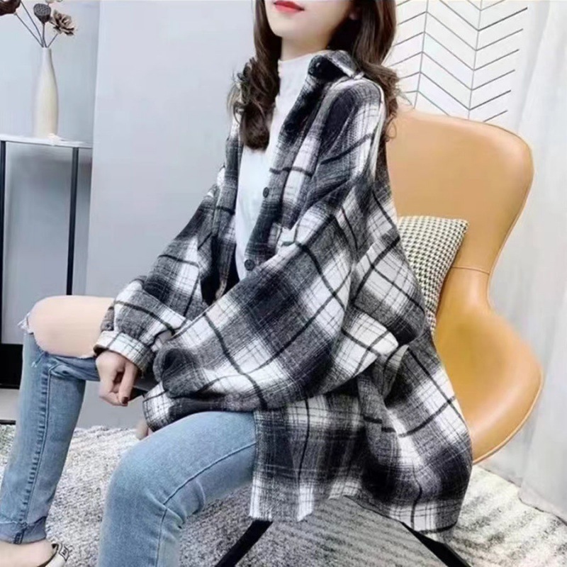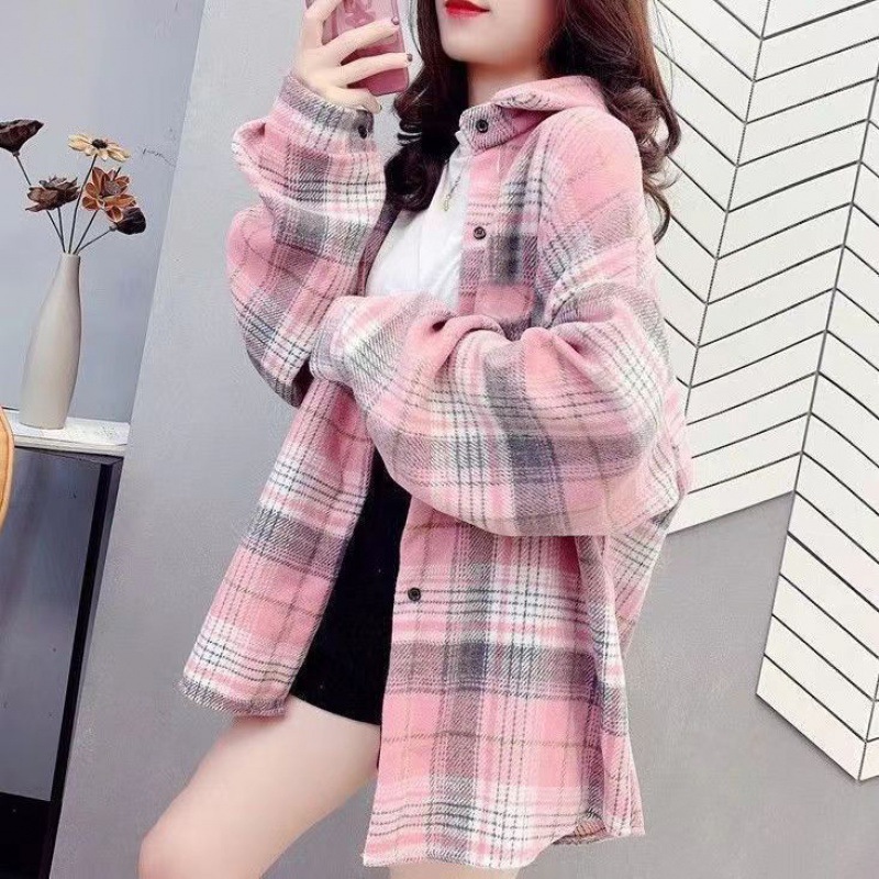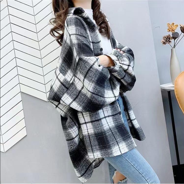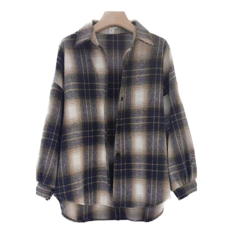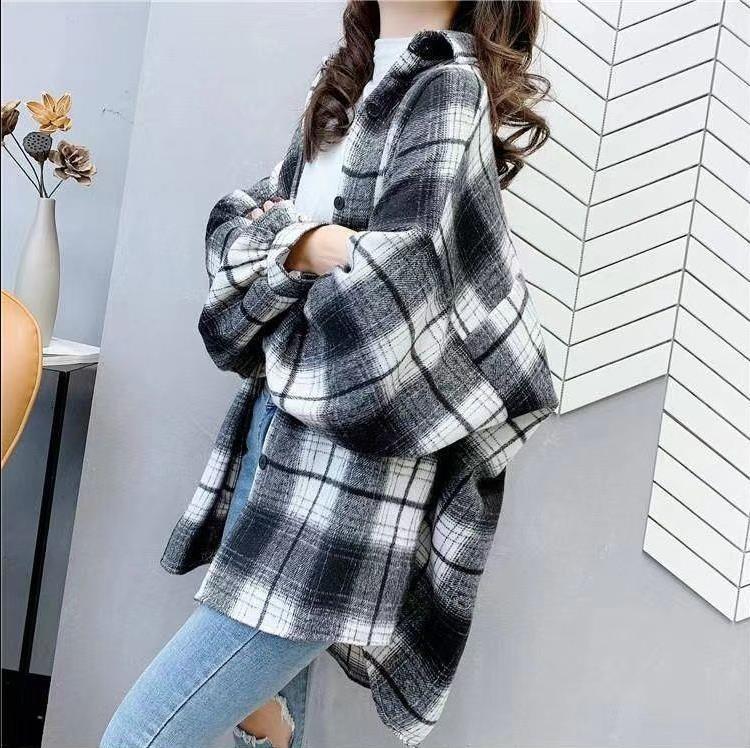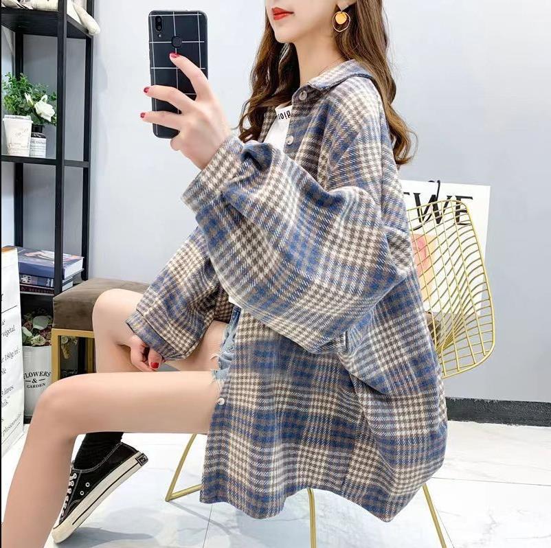 대형 샌딩 두꺼운 모직 격자 무늬 셔츠 여성용 느슨한 중장 가을과 봄 홍콩 스타일 올 매치 셔츠 재킷 트렌디스토어 가기