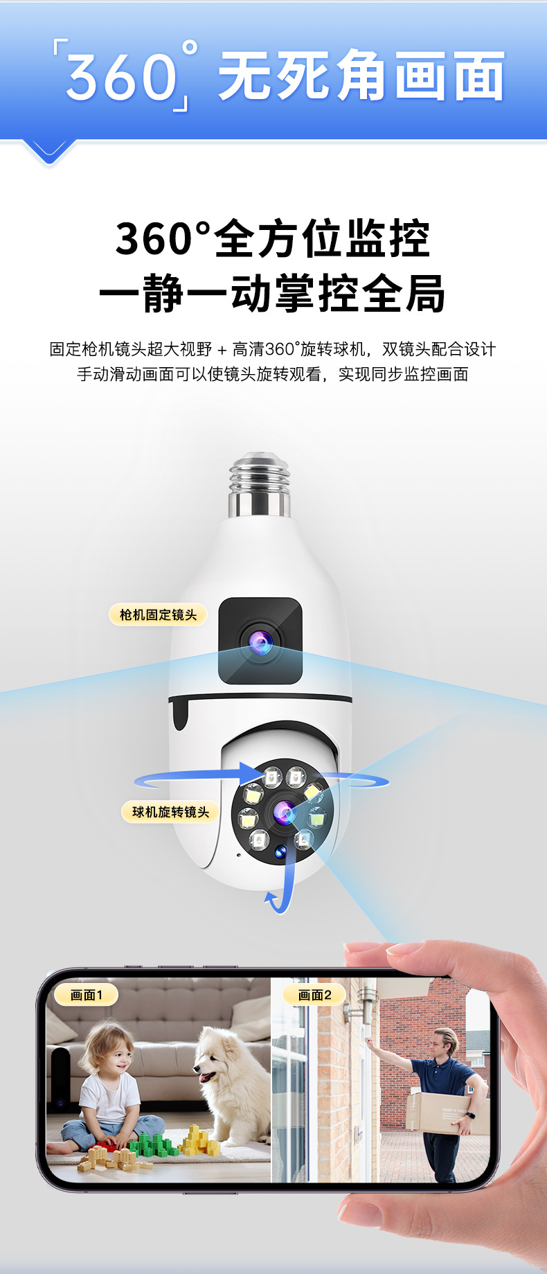 전구 양안 카메라 1080p HD 실내 및 실외 보안 모니터 360 도 듀얼 라이트 회전 카메라