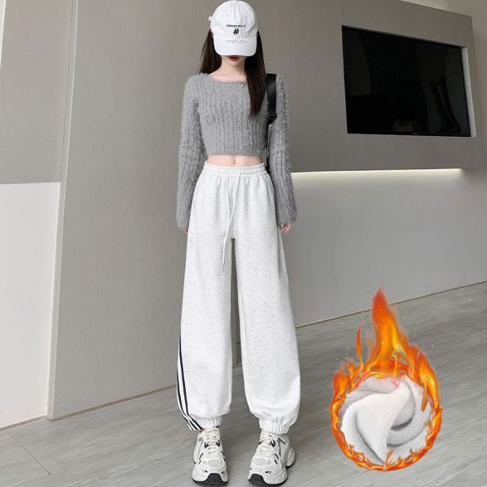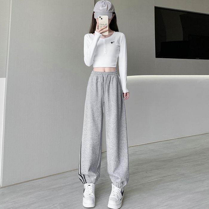 흰색과 회색 다리 스포츠 바지 여성의 가을과 겨울 2024 새로운 높은 허리 슬리밍 캐주얼 3 바 아메리칸 하렌 바지