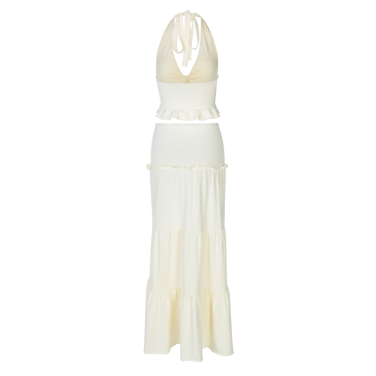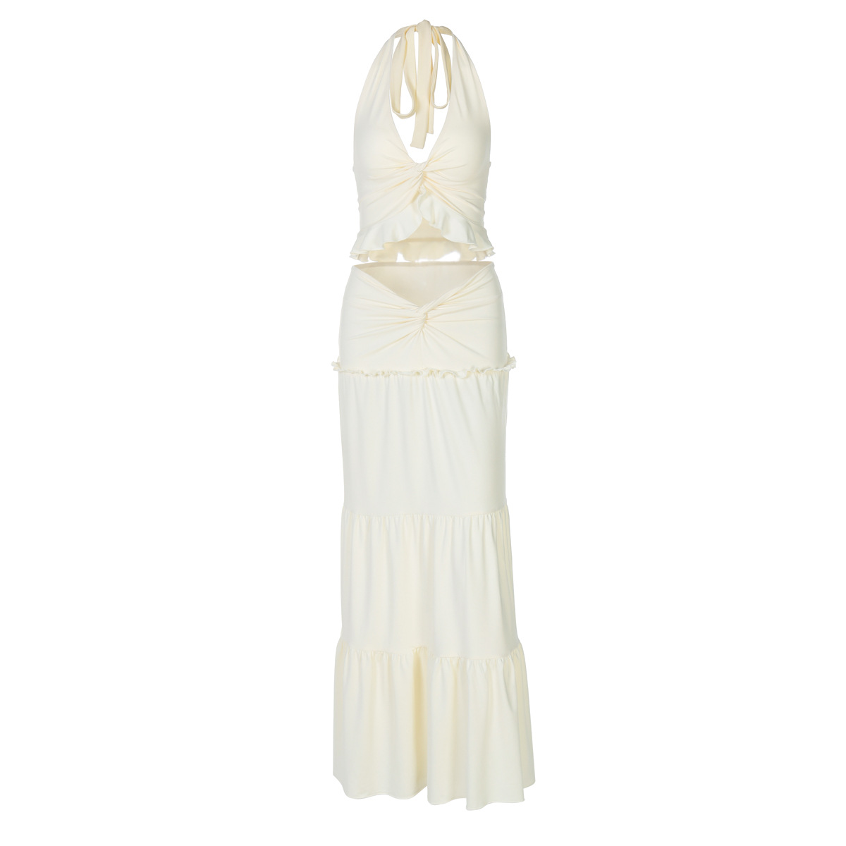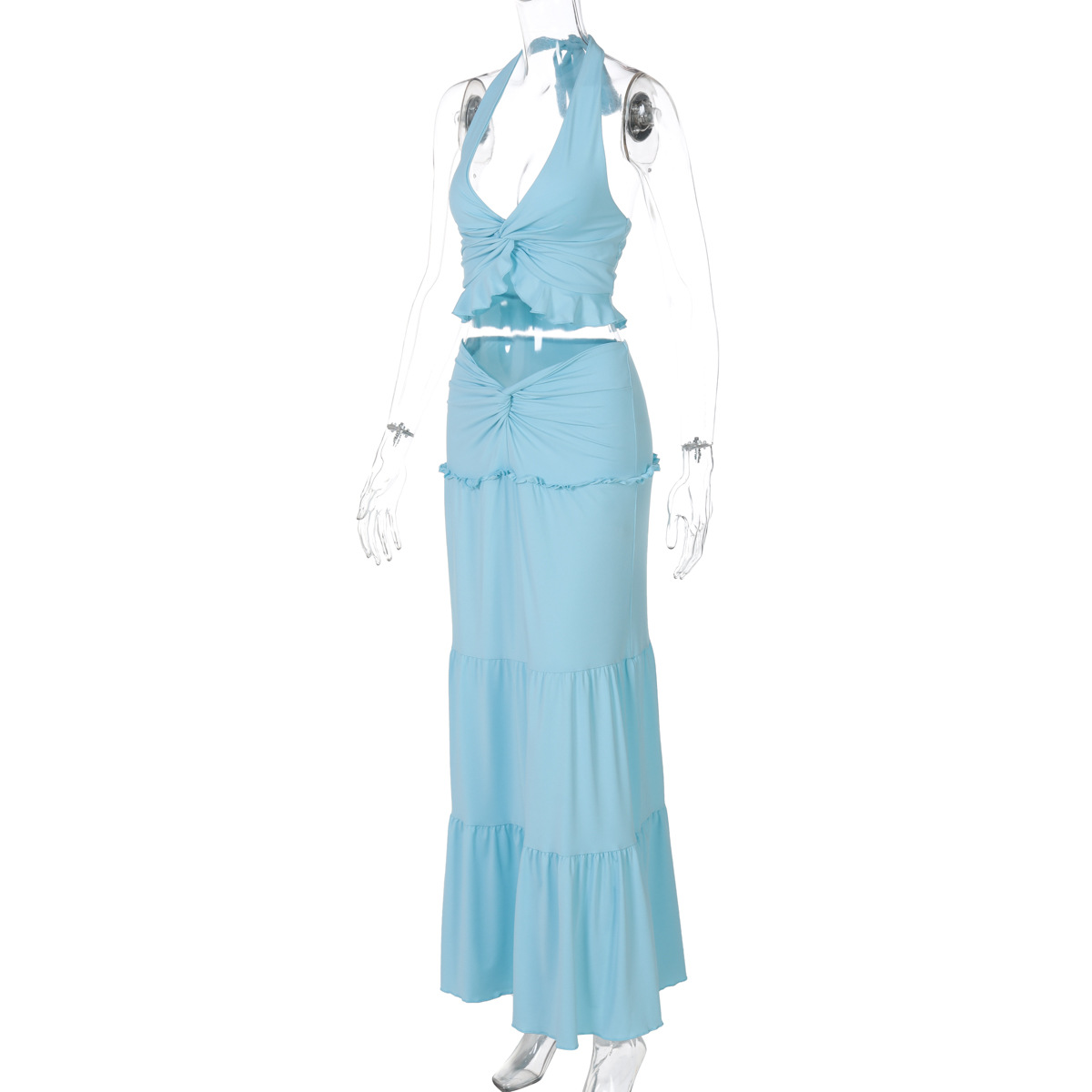 유럽과 미국의 패션 여름 새로운 섹시한 V 넥 귀걸이 홀터넥 디테일 트위스트 롱 스커트 여성용 정장