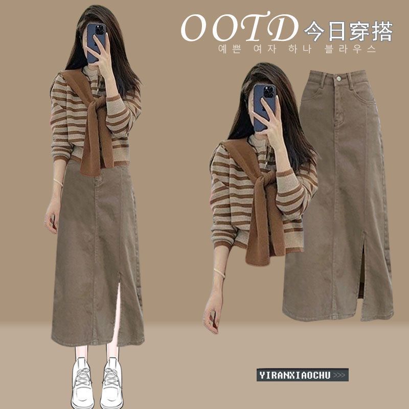 한국 스타일 분위기 착용 여성 2024 년 새로운 서양식 나이 줄이기 목도리 줄무늬 니트 셔츠 3 피스 세트